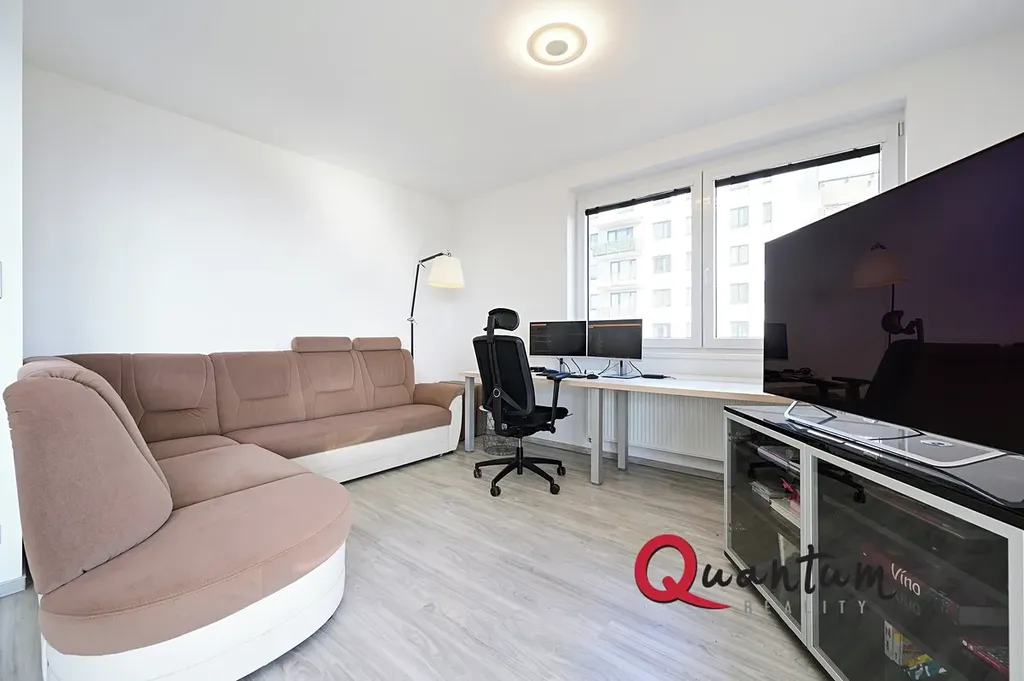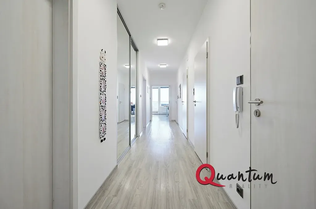 Byt je nabízen částečně zařízený (po dohodě s majitelem). Dispozice zahrnuje tři neprůchozí ložnice, největší z nich má vlastní koupelnu se sprchovým koutem a toaletou. Dále je zde prostorný obývací pokoj se vstupem na balkon, který je orientovaný na jih. Je propojený s kuchyňským koutem stylovou jídelní sestavou. Kuchyňská linka je provedena v moderní lesklé bílé barvě, se špičkovými vestavěnými spotřebiči (indukční varná deska, elektrická trouba, mikrovlná trouba, myčka nádobí). K dispozici jsou dvě koupelny – hlavní s vanou a 2 umývadly, druhá se sprchovým koutem a WC, dále samostatné WC a menší komora v bytě. V obývacím pokoji je instalována klimatizace, plastová okna jsou vybavena žaluziemi, podlahy jsou vinylové, v ložnicích koberce a v koupelnách, komoře a na toaletě dlažby. V chodbě a dvou ložnicích jsou k dispozici vestavěné skříně. V ceně pronájmu je i garážové stání.