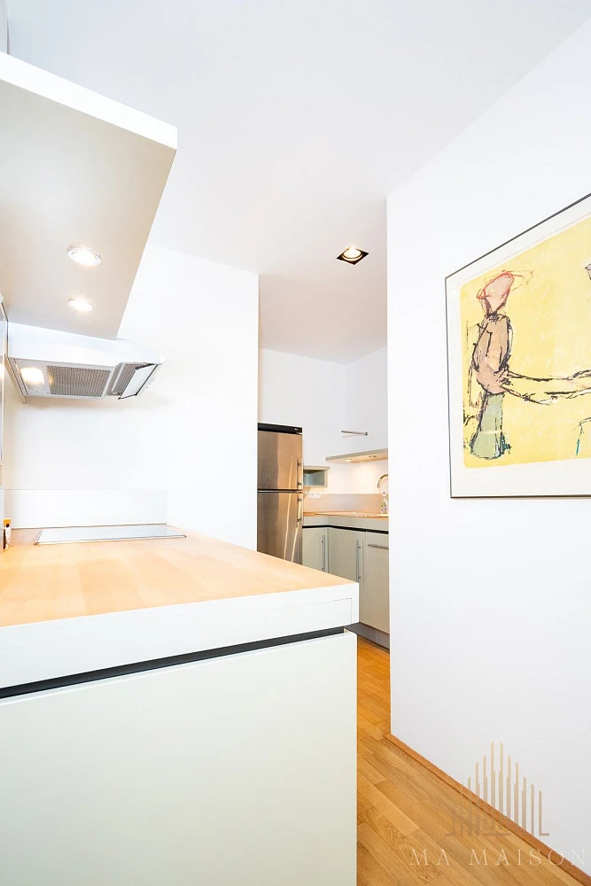 Byt se nachází v posledním patře starší činžovní zástavby. Byt je ve výborném stavu, po rekonstrukci. Je dispozičně členěn do dvou pater, přičemž v přízemí bytu se nachází vstupní hala, toaleta, komora, obývací pokoj a kuchyň. V horním patře je následně ložnice, koupelna a prostorná šatna. Byt je zařízen základním nábytek, který je k nahlédnutí na fotografiích v inzerátu. Samozřejmě je možnost po vzájemné dohodě nábytek odvést z bytu.