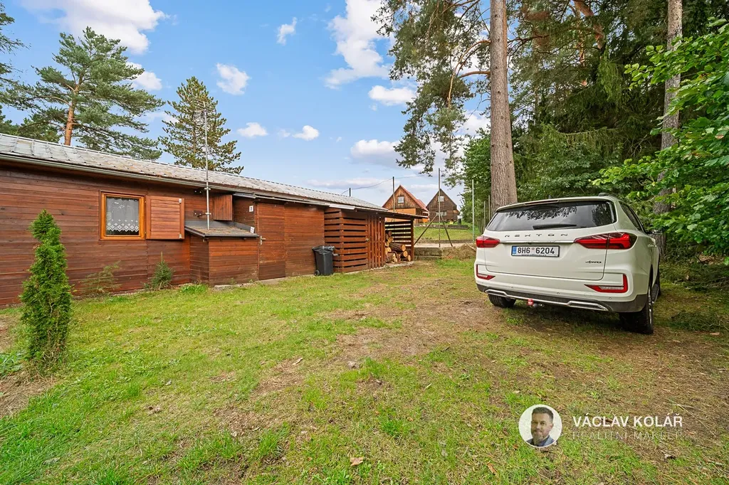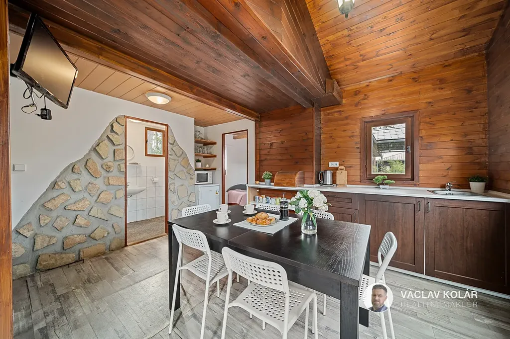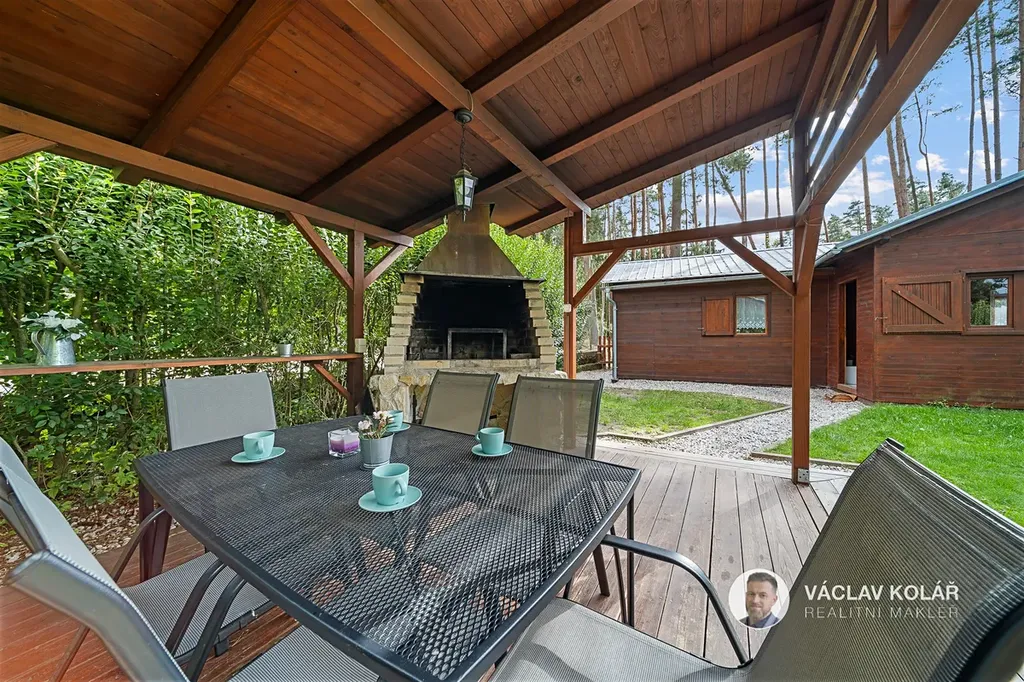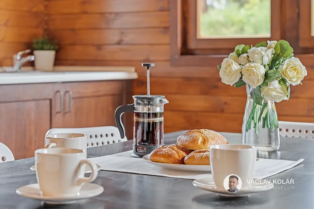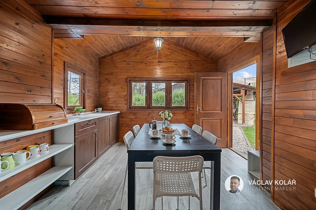 Dřevěná stavba nabízí dvě ložnice, kuchyni s jídelnou a koupelnu se sprchovým koutem a toaletou. Stojí na oploceném pozemku o velikosti 291 m², kde se nachází ještě pergola se zděným krbem, bazén s čističkou, prolézačka pro děti a sklad na dřevo nebo sportovní vybavení.