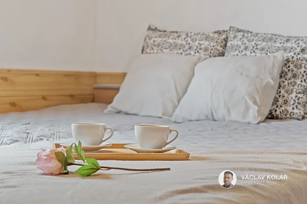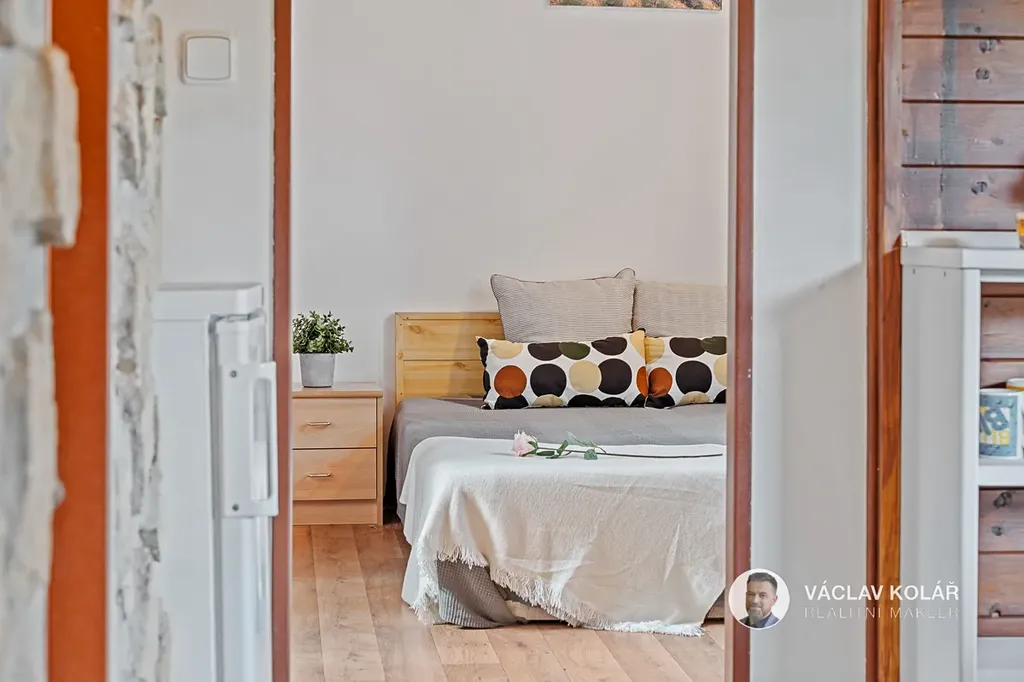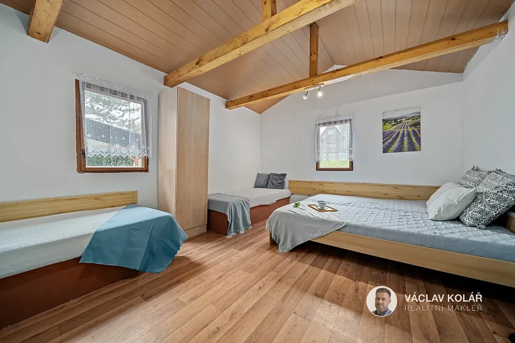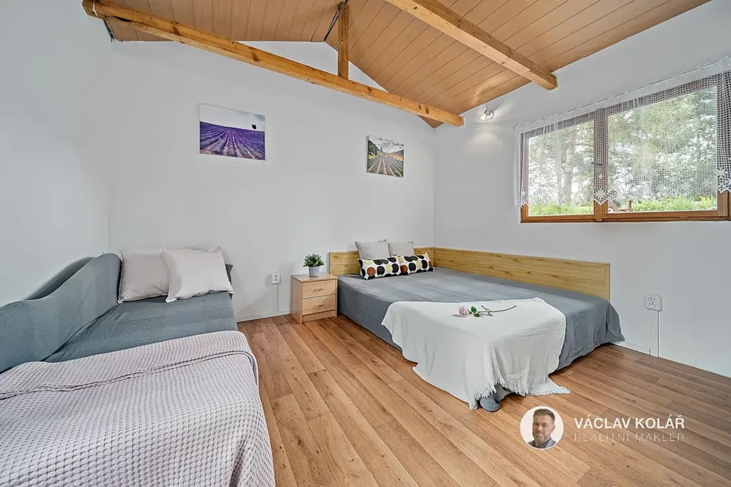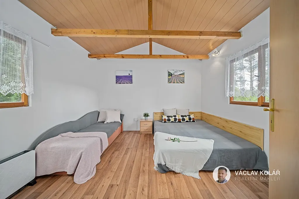 Dřevěná stavba nabízí dvě ložnice, kuchyni s jídelnou a koupelnu se sprchovým koutem a toaletou. Stojí na oploceném pozemku o velikosti 291 m², kde se nachází ještě pergola se zděným krbem, bazén s čističkou, prolézačka pro děti a sklad na dřevo nebo sportovní vybavení.