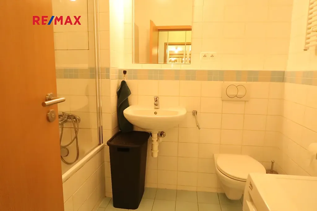Hlavní obytná místnost s kuchyňským koutem je plně vybavena nábytkem, konkrétně rozkládací pohovkou, stolem se dvěma židlemi a televizní skříňkou. Tento nábytek může v bytě zůstat, případně je možné jej po domluvě odstranit. Součástí bytu je také vstupní chodba s velkou vestavěnou skříní, která poskytuje dostatek prostoru pro uložení věcí. Dále je zde prostorná koupelna s toaletou, kde je umístěna pračka se sušičkou, která může rovněž zůstat součástí vybavení.