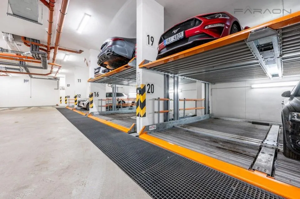 Součástí nájmu je také garážové parkovací stání a sklepní kóje.