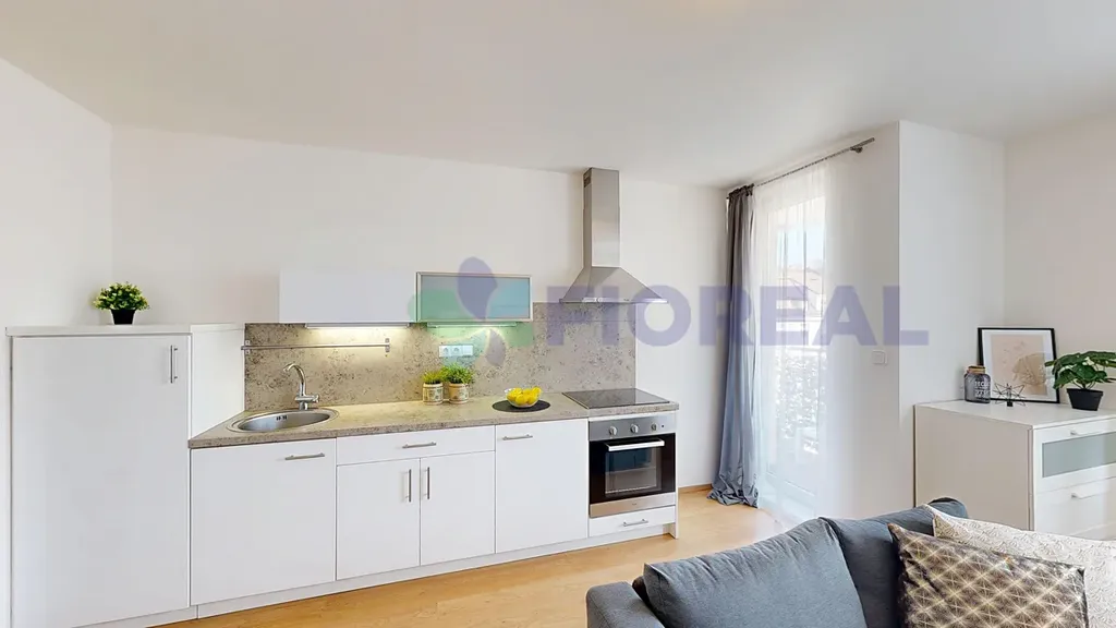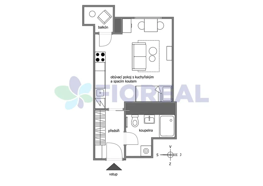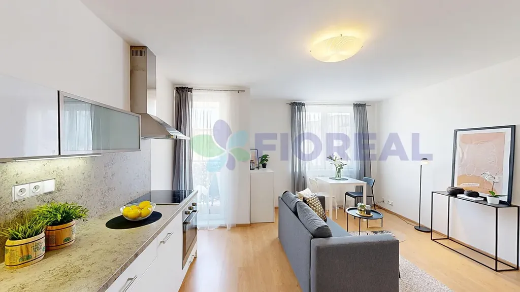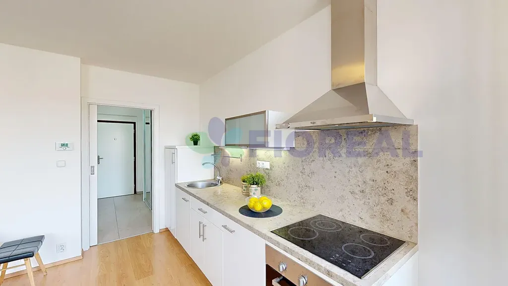 Interiér pokoje je vybavený novým nábytkem: pohovka s úložným prostorem, postel s úložnými díly, komoda, jídelní stůl a židle. Dekorace a textilie na fotografiích nejsou součástí pronájmu. V místnosti je zároveň kuchyňský kout s lednicí, digestoří, el. varnou deskou a troubou. Myčka zde není. V předsíni jsou k dispozici velkorysé úložné prostory v podobě vestavných skříní.