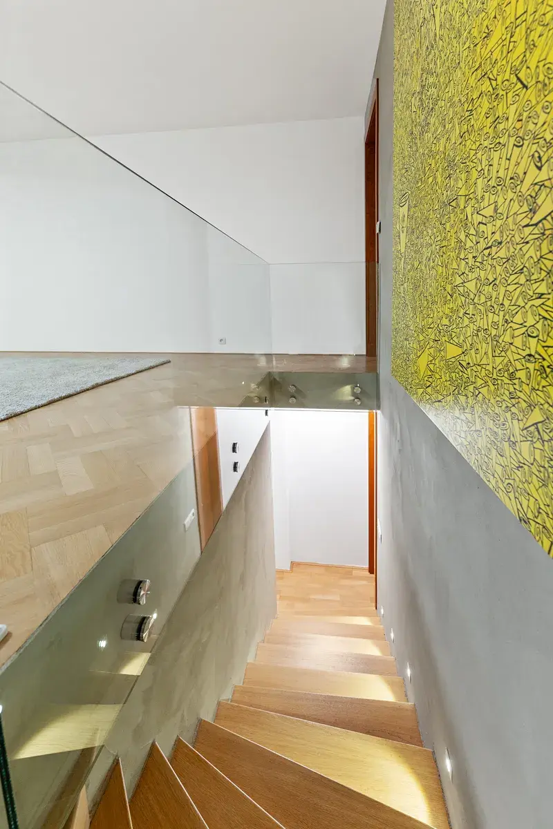 Luxusní atmosféru podtrhují kvalitní dřevěné podlahy, designové osvětlení a vestavěný audiosystém, díky kterému si můžete vytvořit dokonalou náladu pro každý okamžik.