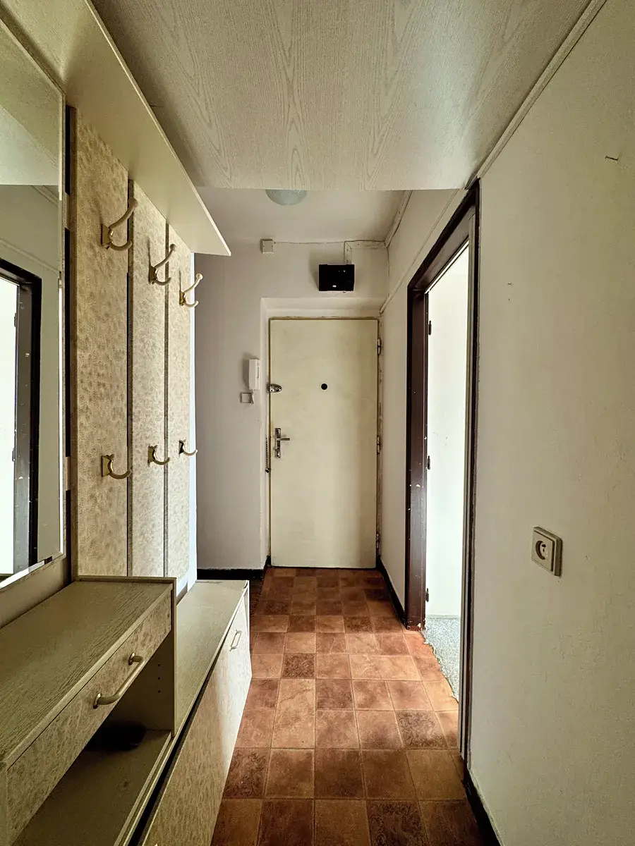 Byt je v původním stavu a skládá se z předsíně, odděleně řešené koupelny a toalety, kuchyně, obývacího pokoje a ložnice. Z chodby je přístup do kuchyně a obývacího pokoje. Do ložnice je přístup z kuchyně nebo obývacího pokoje. Z obývacího pokoje se dostanete na balkon. V kuchyni je linka s plynovým sporákem. Okna v bytě jsou plastová. K bytu také patří sklepní kóje (2 m2). Sousedé a celkově vchod je klidný a čistý.