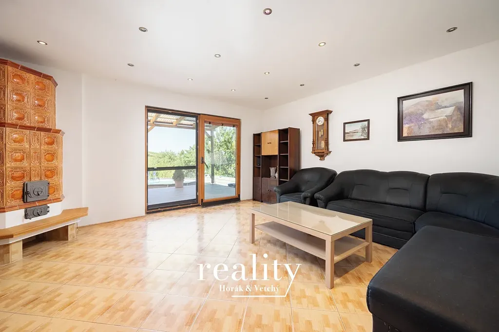 Hlavní obytné části propojuje centrální hala (5,41 m²). Vpravo se nachází kuchyně s jídelnou (22,37 m²) a přilehlou spíží (1,47 m²). Naproti vstupu je komora (2,46 m²) a prostorná ložnice (14,10 m²) – ideální jako pokoj pro hosty, pracovnu nebo bezbariérové bydlení. Z haly vlevo vede vstup do obývacího pokoje (21,34 m²) s krásnými kachlovými kamny a velkými posuvnými dveřmi na zastřešenou terasu (15,1 m²) s výhledem na vinice, Pálavu a kostel sv. Linharta.