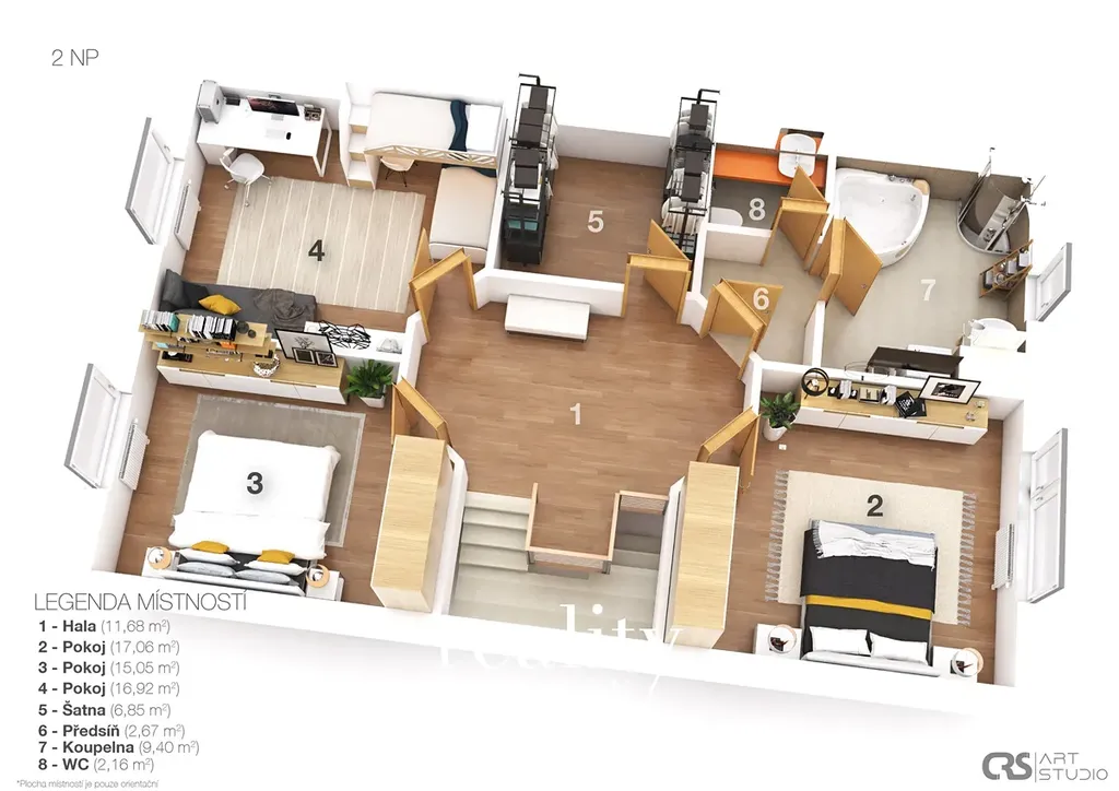Horní patro tvoří centrální hala (11,68 m²), tři samostatné pokoje (17,06 m², 15,05 m² a 16,92 m²), šatna (6,85 m²), předsíň (2,67 m²) a samostatné WC (2,16 m²).