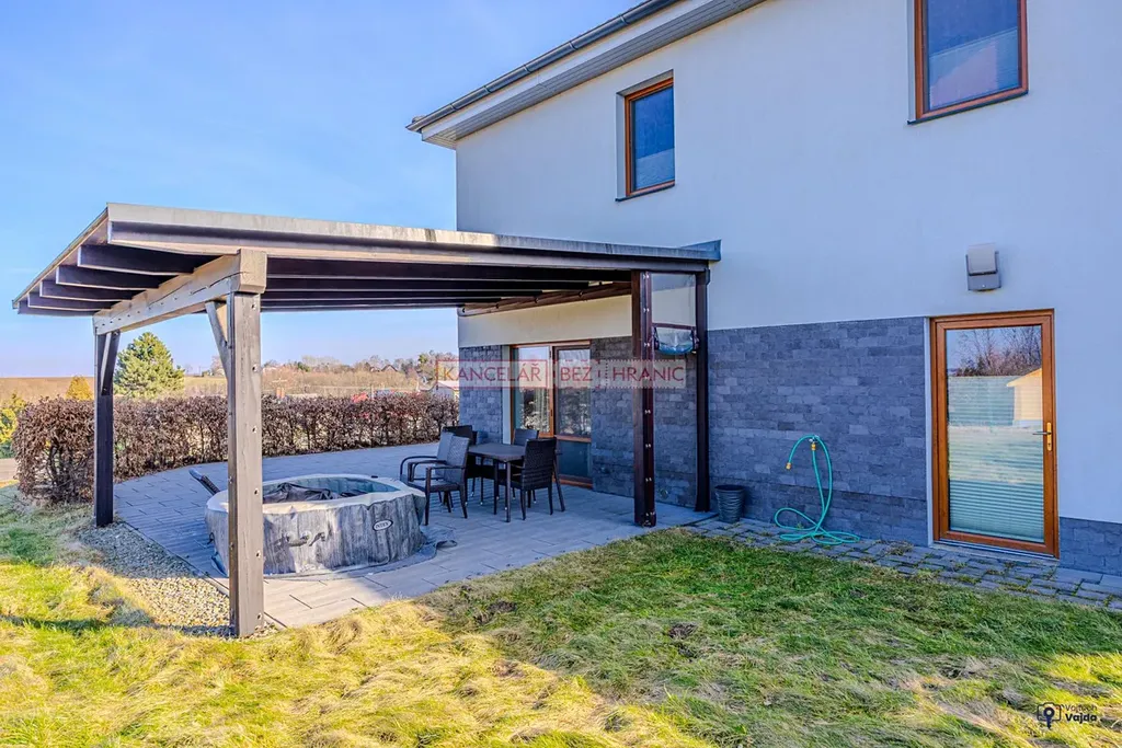 Dominantou domu je světlý obytný prostor s jídelnou, ze které je přímý vstup na terasu a do stylové dřevěné pergoly s posezením, ideální pro relaxaci, rodinné večeře i setkání s přáteli.