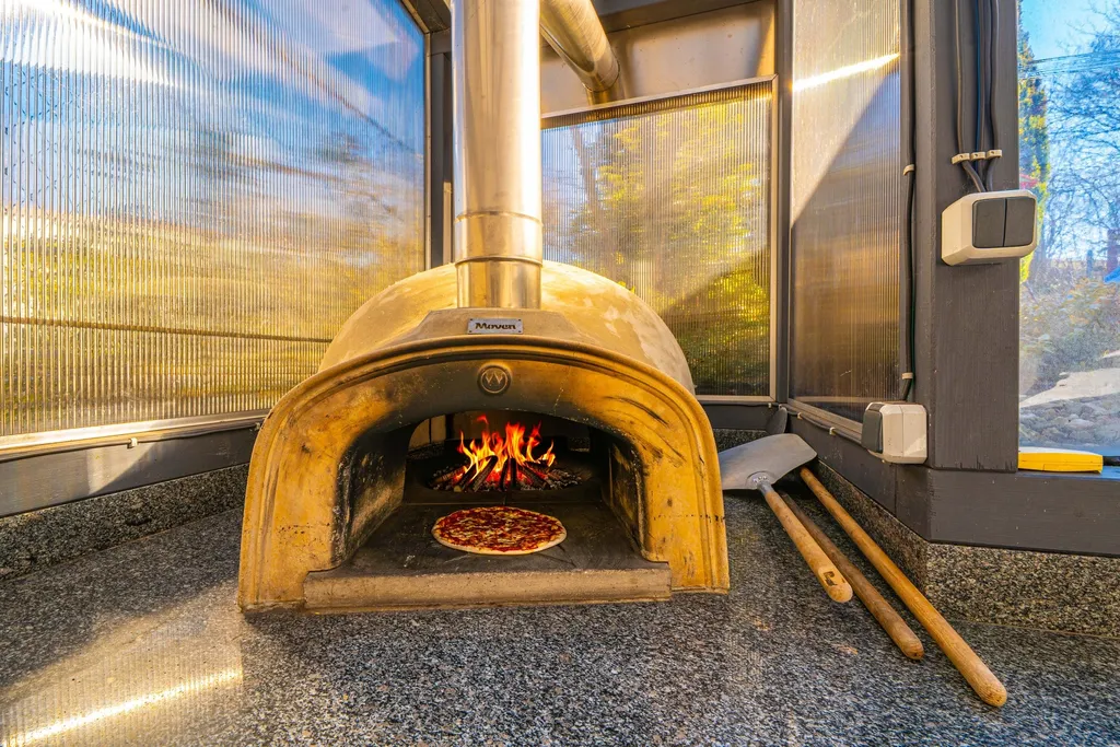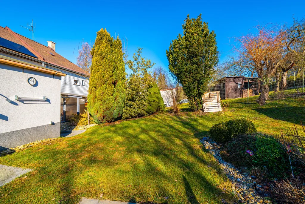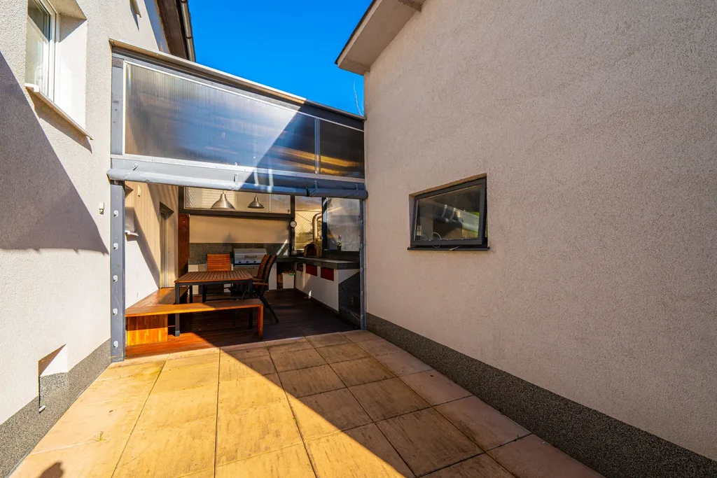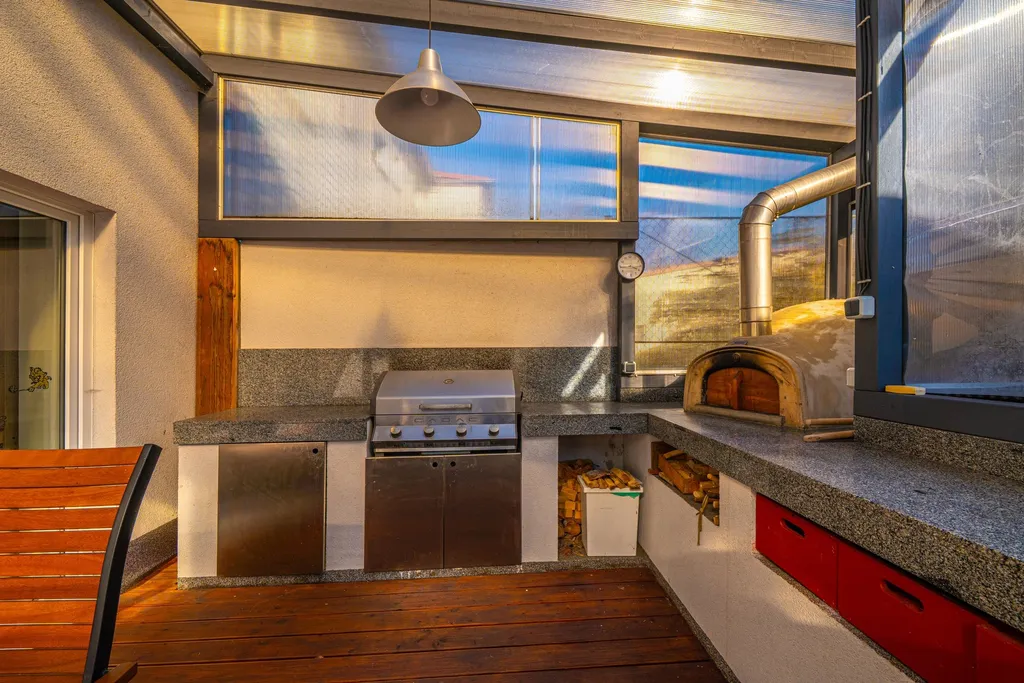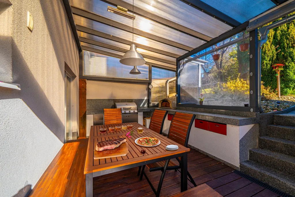 Gastronomické zážitky můžete zažít na vlastní terase. Dominantou venkovního prostoru je zastřešená terasa vybavená profesionální pecí na pizzu a samostatným grilem. K domu náleží menší zahrada se skleníkem, ideální pro pěstování vlastní zeleniny. Technologie a úspory - fotovoltaika zajišťuje výrobu vlastní elektrické energie.