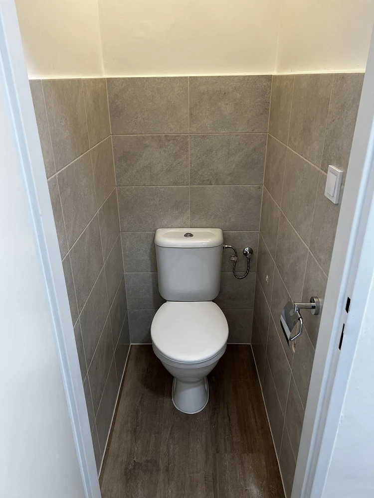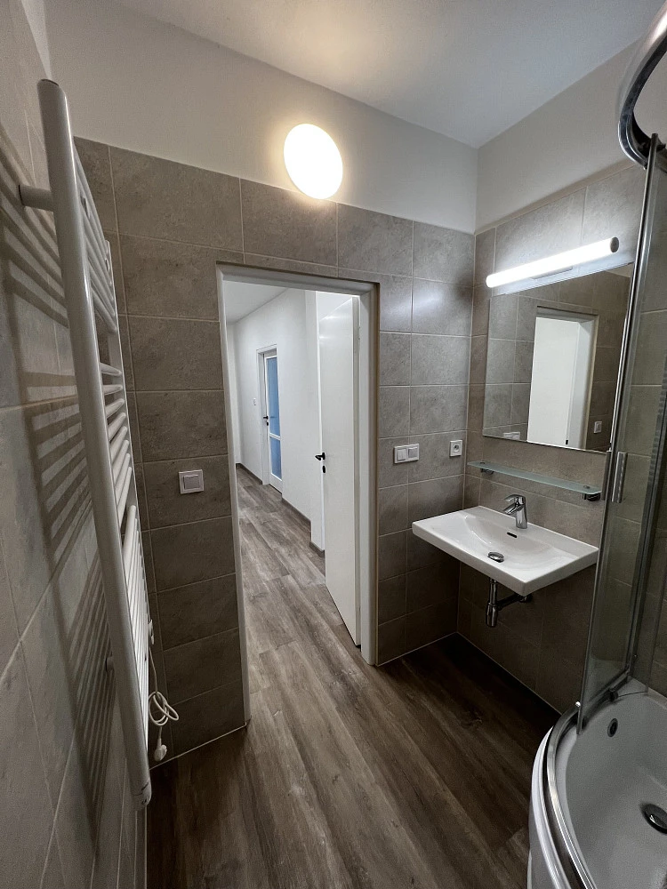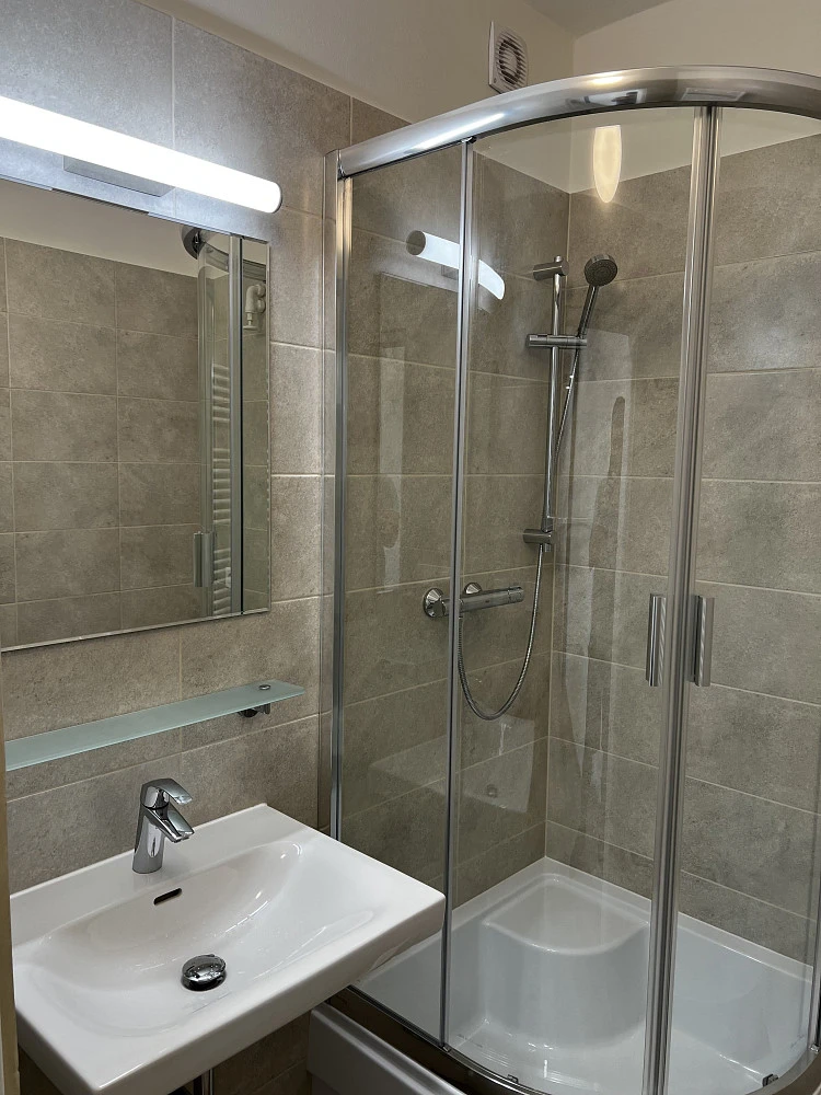 Moderní koupelna se sprchovým koutem s vyvýšenou vaničkou a sezením, kde je možné pohodlně koupat i malé děti, termostatická sprchová baterie na nastavení teploty vody, umyvadlo, zrcadlo s nasvícením, přívod pro pračku, otopný žebřík na sušení ručníků, ventilátor na odvod par. Samostatné WC s automatickým ventilátorem.