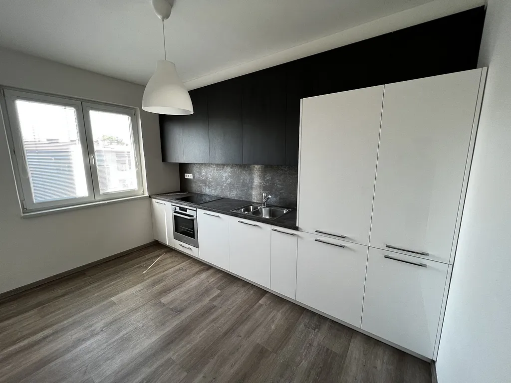 Kuchyně je vybavena moderní kuchyňskou linkou od společnosti HANÁK NÁBYTEK, která je řešena od podlahy až ke stropu. Jedná se o lakovanou kuchyni v kombinaci s dřevodekorem dub karbon. Kuchyně je vybavena indukční varnou deskou, digestoří s odtahem mimo byt, horkovzdušnou troubou s grilem, myčkou nádobí o rozměru 60 cm, vestavěnou lednicí s mrazákem, potravinovou skříní a prostornými horními skříněmi až ke stropu. Horní skříně jsou osazeny liniovým LED osvětlením a je tak zajištěno nasvětlení celé pracovní plochy. Rozsvícení světel je bezdotykové pomocí senzoru.