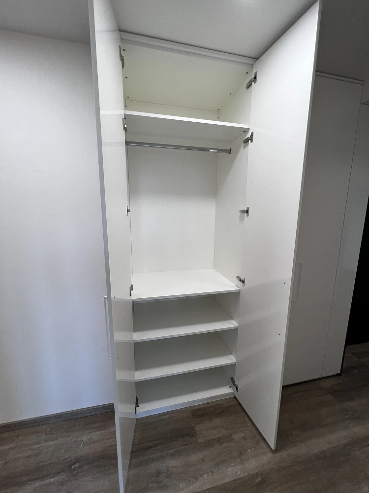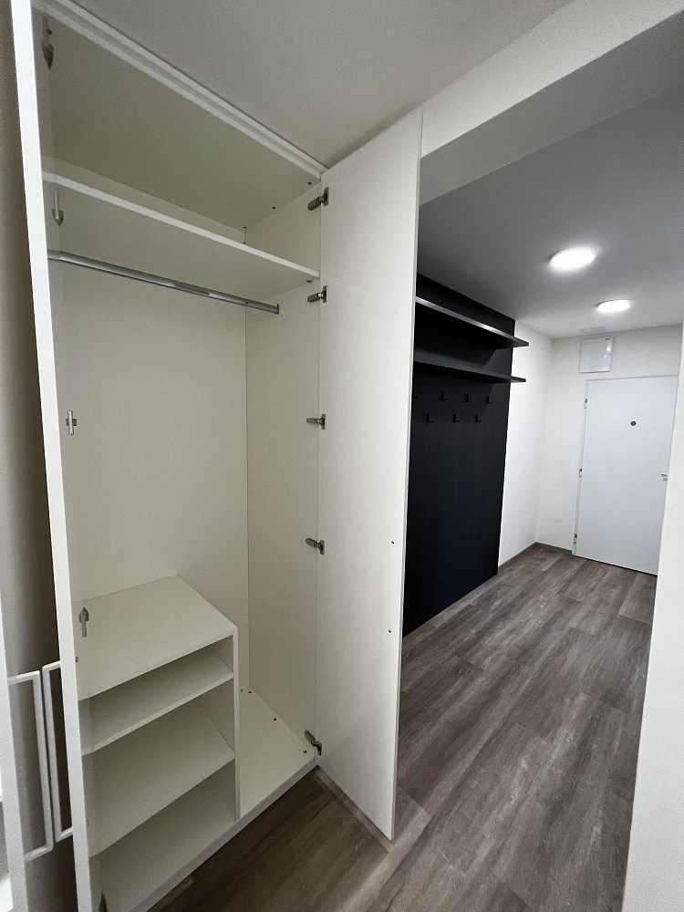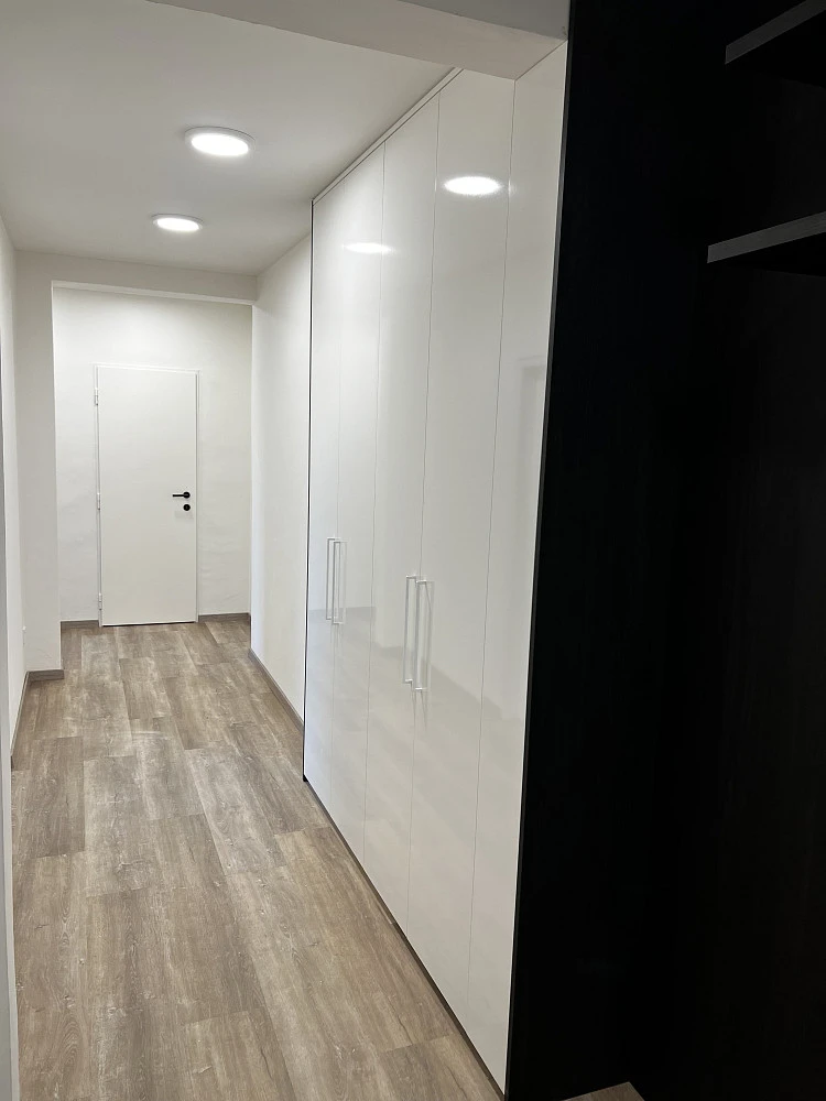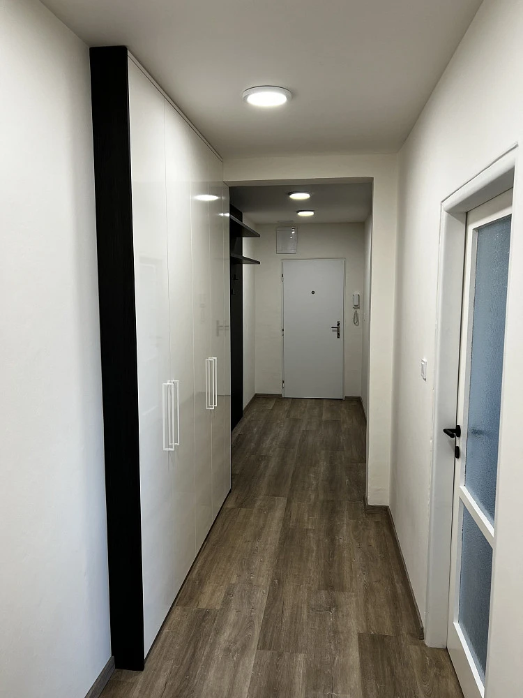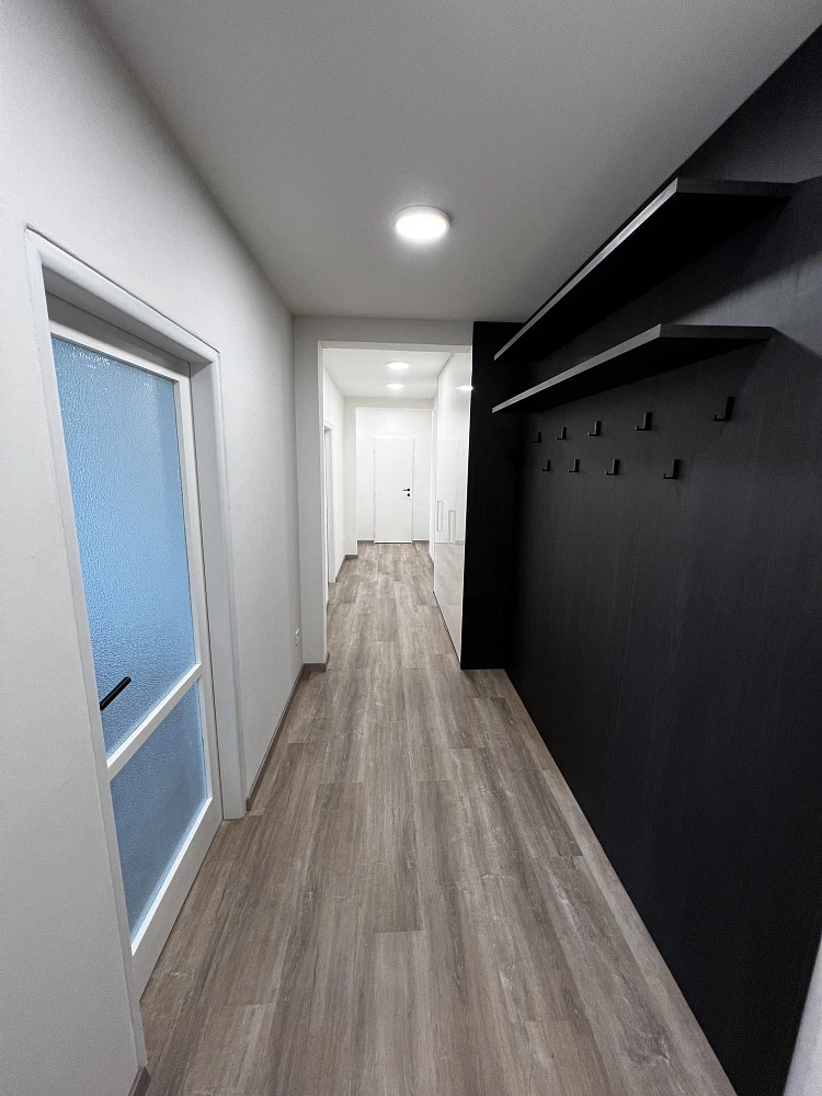 Vstupní chodba je vybavena krásnými vestavěnými skříněmi a věšákovou stěnou s policemi od prestižního výrobce nábytku, společnosti HANÁK NÁBYTEK. V chodbě je spoustu prostoru na odložení si věcí při vstupu do bytu, stejně tak prostorné vestavěné skříně umožňují uložení sezonních i pravidelně používaných věcí. Celá chodba je skvěle nasvícena.