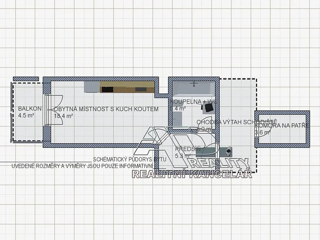 Dispozice: předsíň [5,3m2], obytná místnost s kuchyňským koutem [18,0m2] a balkonem [4,4m2], koupelna s WC [4,8m2]. K dispozici je sklepní koje na patře bytu o výměře [3,6m2]. K dispozici je jedno vyhrazené venkovní parkovací místo na uzavřeném / soukromém pozemku za domem.