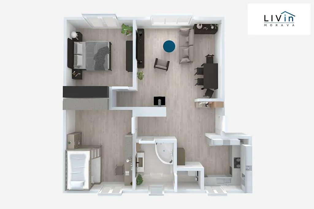Dispozice bytu zahrnuje prostornou obývací místnost propojenou s halou a kuchyní (37 m²), dále ložnici (13,5 m²), dětský pokoj (15,6 m²), koupelnu (5 m²) a samostatné WC (1,5 m²). K bytu rovněž náleží sklep o výměře cca 5 m².