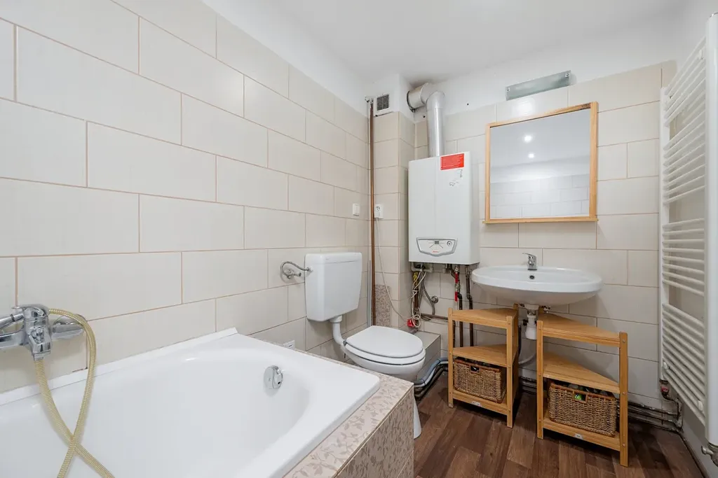 • koupelna s vanou, umyvadlem, otopným žebříkem a WC