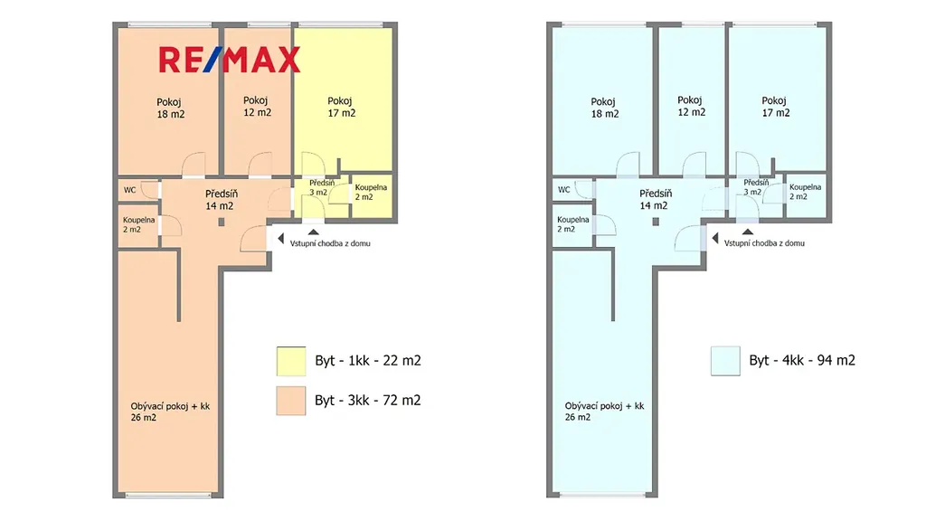 2) dva byty a to garsonka (1 koupelna) o výměře 22 m2 a byt 3kk (1 koupelna, toaleta samostatně) o výměře 72 m2.