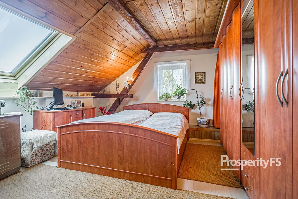 V patře najdete bytovou jednotku 3+1 s velkým obývacím pokojem vybaveným kamny a balkonem, dvěma neprůchozími prostornými ložnicemi, kuchyní, samostatnou koupelnou a WC.