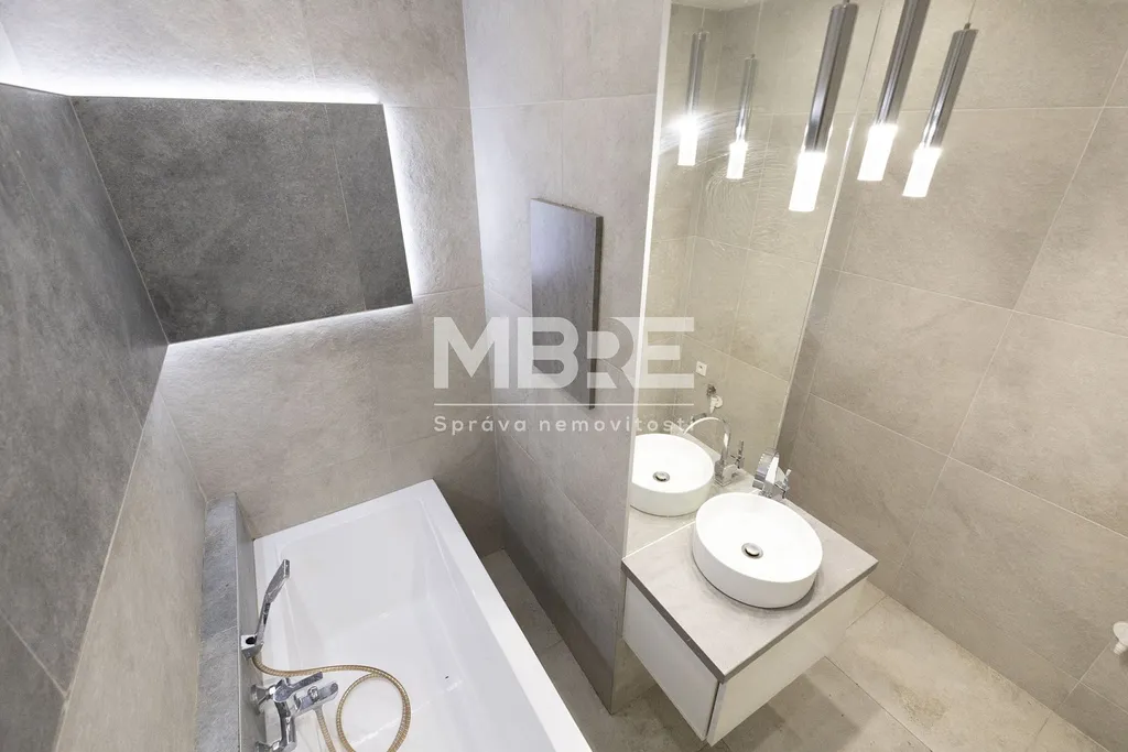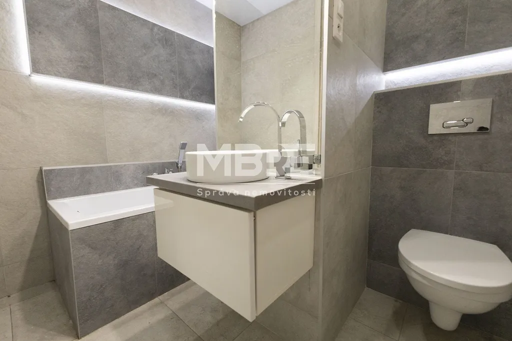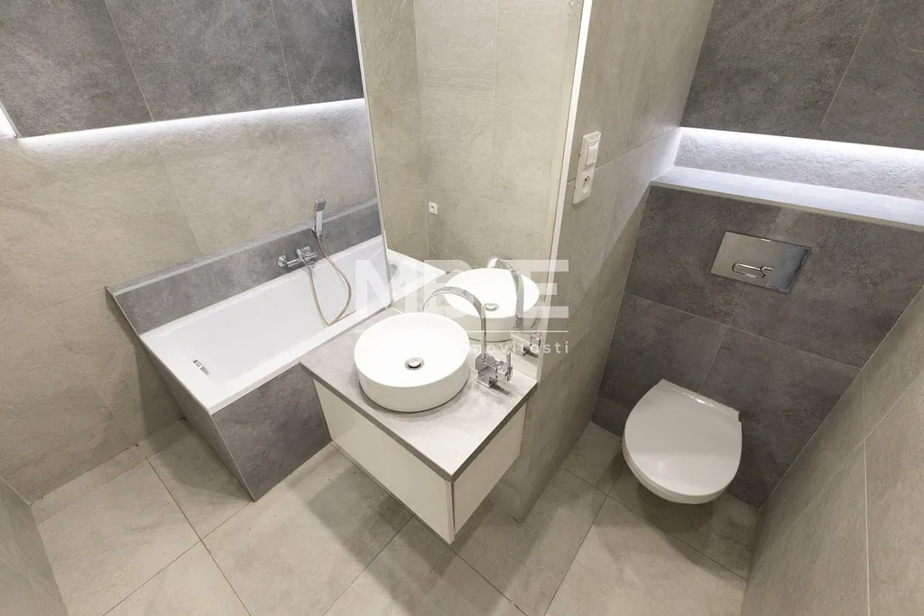 Koupelna potěší vanou s podsvícením a samostatným WC.