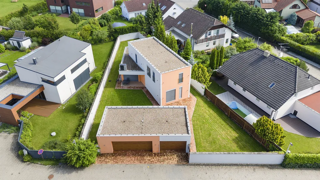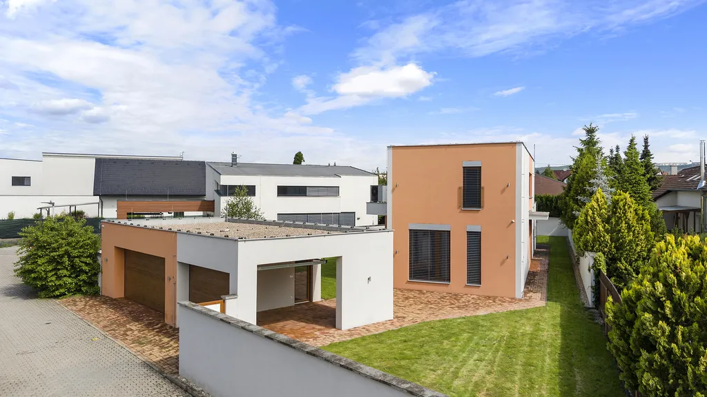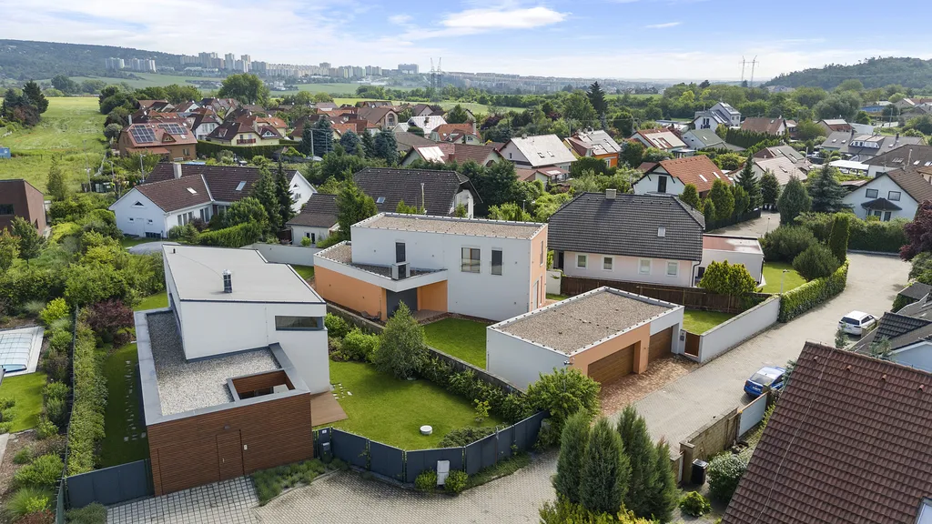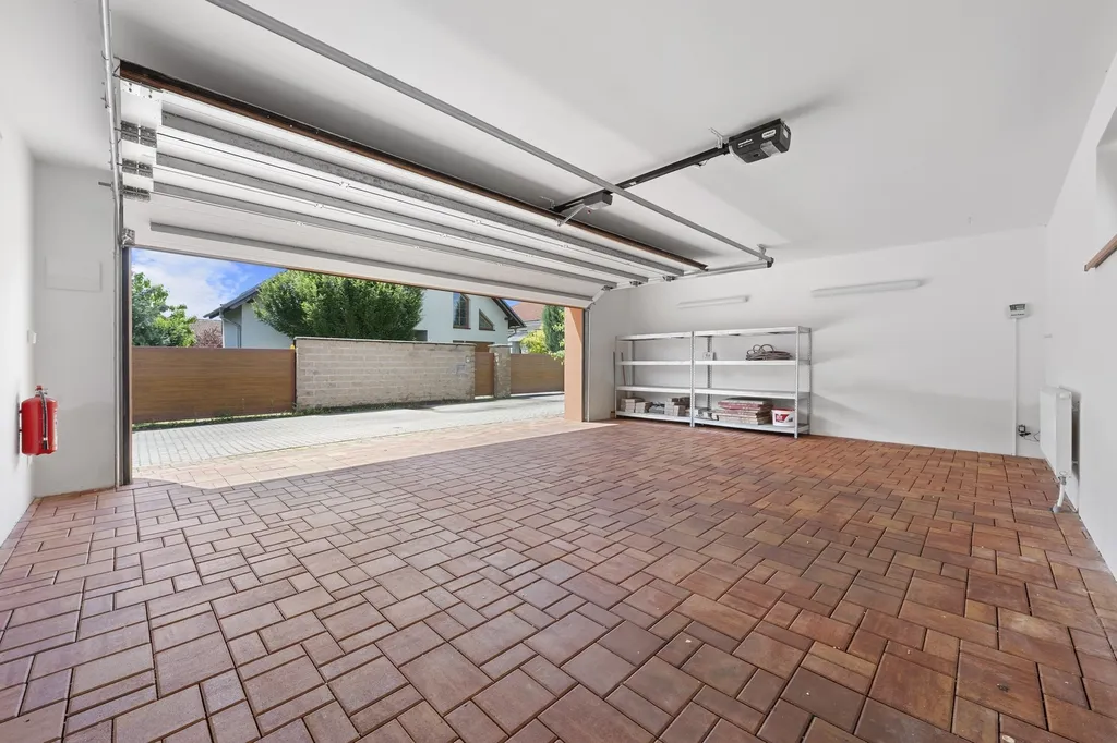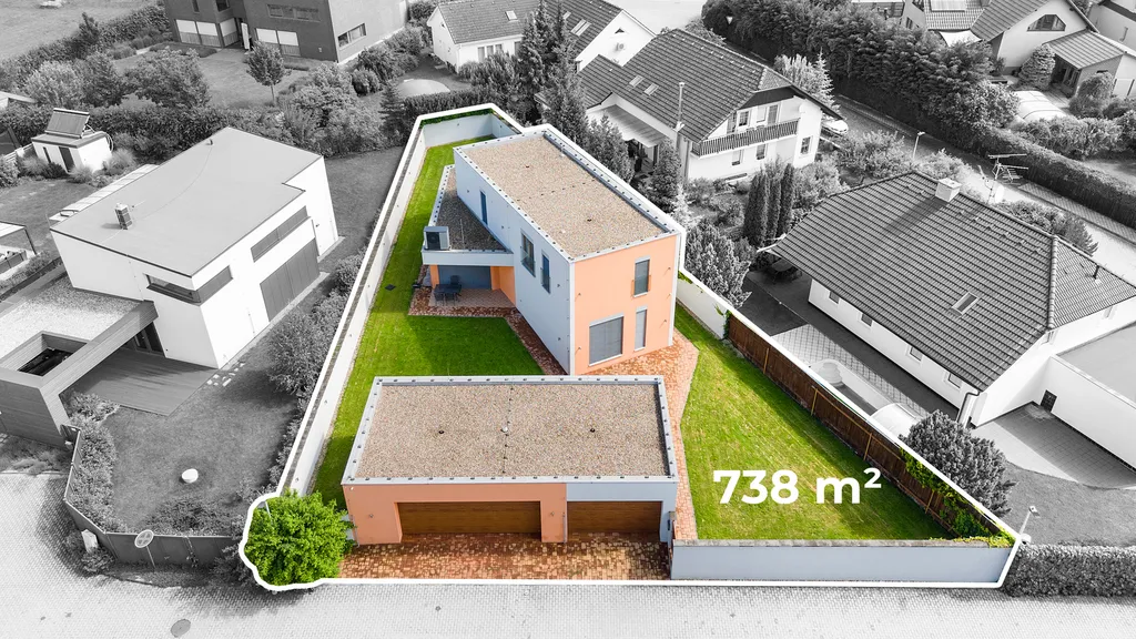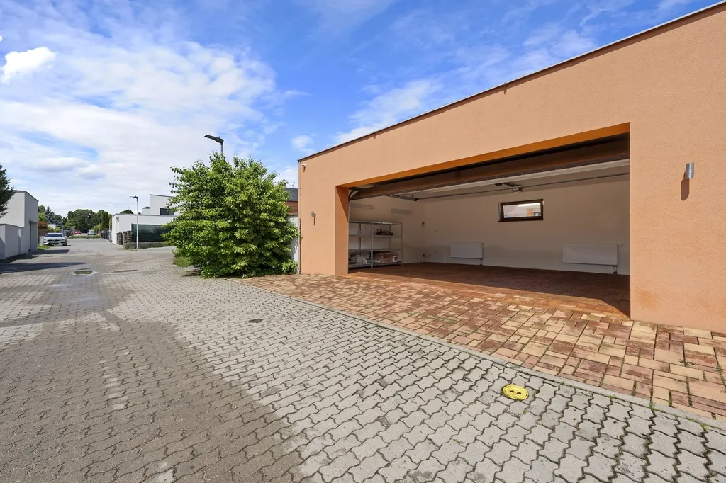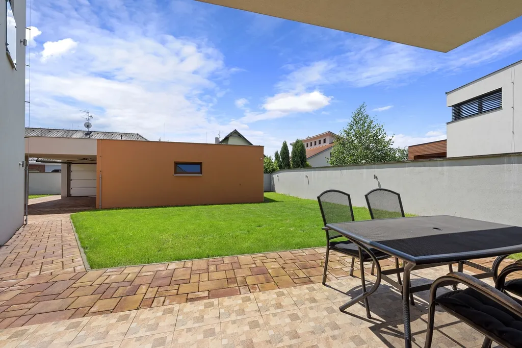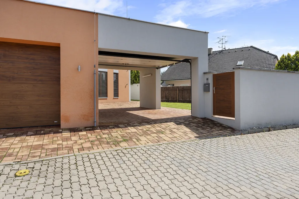 Nemovitost dále nabízí garáž pro dvě parkovací místa, kryté parkovací stání (carport) a venkovní relaxační plochy, které rozšiřují možnosti využití domu. Pozemek o velikosti 738 m² poskytuje dostatek soukromí i prostoru pro zahradu, terasu či další volnočasové aktivity.