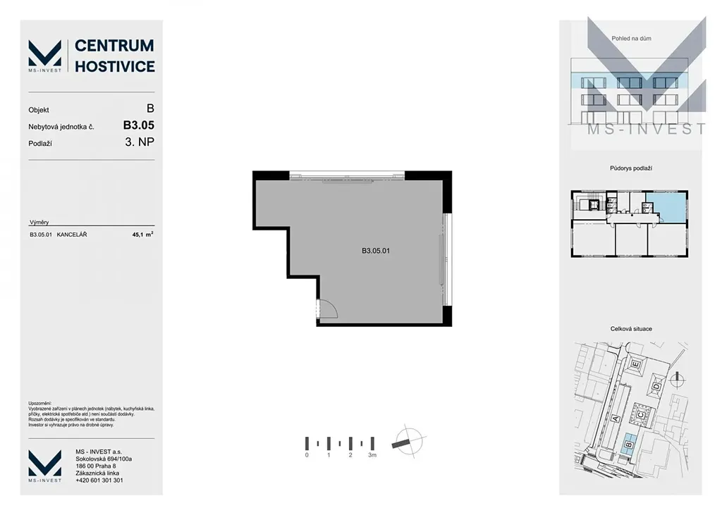 Nabízíme komerční jednotku o ploše 45m2 ve 3. NP (č. B 305 ) v novostavbě projektu Centrum Hostivice s výtahem. Možné využití kancelář, obchod, ordinace, apod. Velká okna zajištují maximální přísun přirozeného světla, proti slunci jsou naistalovány hliníkové předokenní žaluzie, ve standardu je dále příprava na klimatizaci, podlahové vytápění a další. Jednotky v posledním 3NP mají vysoké stropy (3,8m) které umožnuji si pohrát s interiérem a ještě lépe využít nabízený prostor.