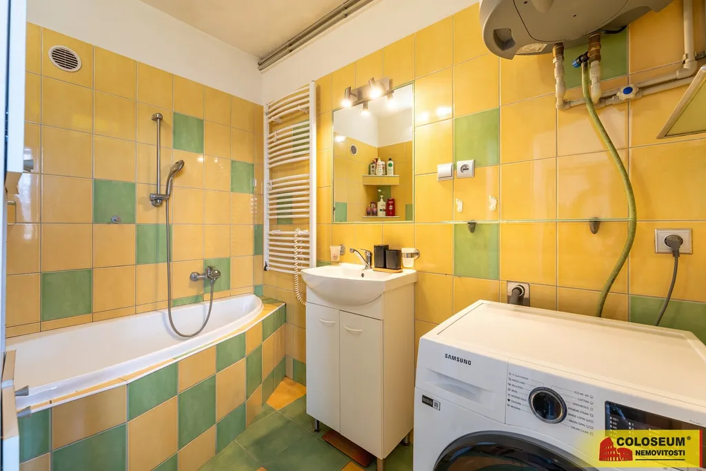 Byt má zděné bytové jádro. Koupelna a samostatné WC prošly rekonstrukcí v roce 2011. Vytápění je řešeno elektrickým podlahovým topením, v pokojích jsou radiátory. Ohřev vody zajišťuje elektrický bojler, který je nový. Elektroinstalace je v bytovém jádru vedena v mědi, v pokojích je původní hliníková. K bytu náleží sklepní kóje a k dispozici je také společná kočárkárna a prádelna.