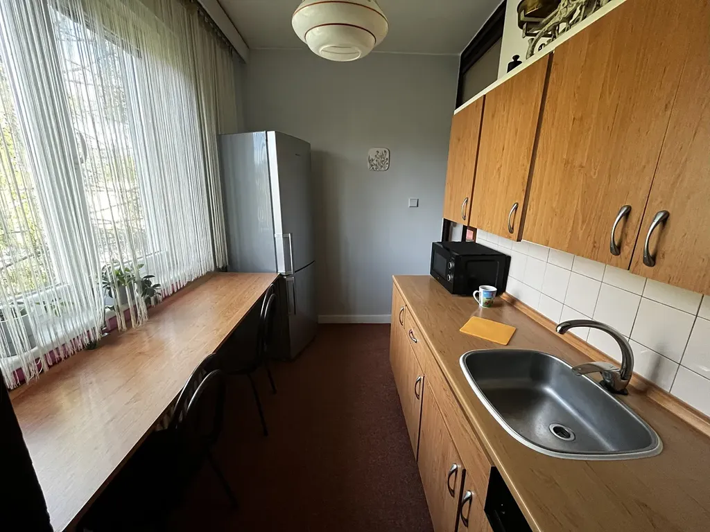 Dispozici tvoří kuchyně se zánovní kuchyňskou linkou, obývací pokoj a dva samostatné pokoje s původními dřevěnými parketami, lodžie s výhledem do zeleně.