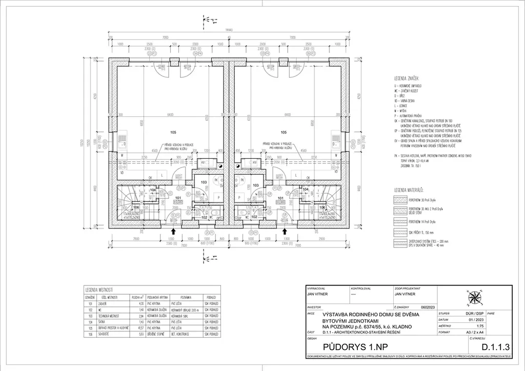 Jednotka disponuje podlahovou plochou 106 m2. V 1 NP se nachází velký obývací pokoj s kuchyňským koutem o výměře 41 m2, vstupní hala, technická místnost, toaleta s umyvadlem a šatna pod schodištěm. Kuchyně s vestavěnými spotřebiči zn. Candy je součástí prodeje. Obývací pokoj je prosvětlen velkými francouzskými okny a v jeho rohu je připravený komín na instalaci krbových kamen. V technické místnosti je umístěn centrální kotel a připravený přívod vody a odpad pro pračku se sušičkou.