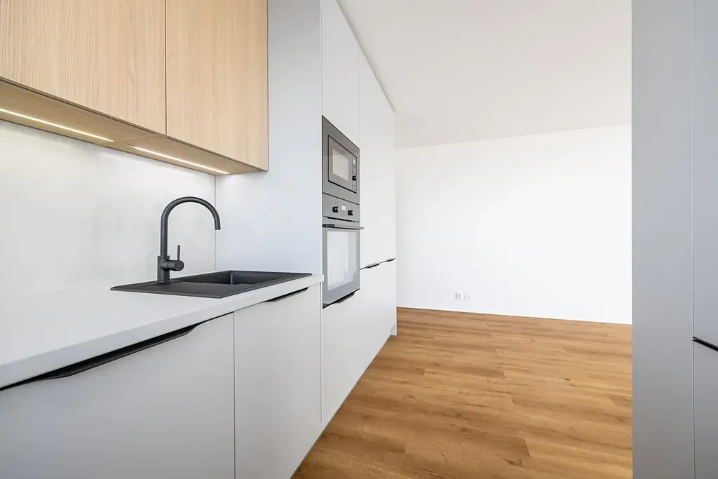 Kuchyně je vyrobena na míru od truhláře a je kompletně vybavená spotřebiči (elektrická trouba, mikrovlnná trouba, indukční deska, myčka). Kuchyně je prosvětlená oknem přímo nad pracovní deskou a velkými okny v obývacím pokoji a nabízí mnoho úložných prostor pro každodenní využití. Kuchyně byla navržena s důrazem na praktičnost a dostatek úložných prostor.