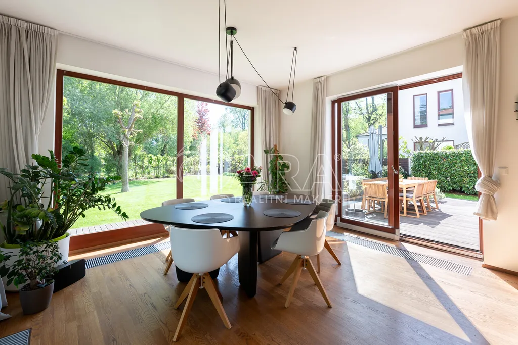 Dvoupodlažní dům s rozlohou 285 m2, který je charakteristický čistými liniemi a velkými francouzskými okny, nabízí v přízemí velkorysý obývací pokoj, prostornou jídelnu a kompletně zařízenou kuchyň s vestavěnými spotřebiči se vstupy na zahradu. V 1. patře se nachází hlavní ložnice s koupelnou a šatnou, dva dětské pokoje, jeden z nich s koupelnou, pokoj pro hosty a velká koupelna se sprchou a samostatně stojící vanou od designéra Philippa Starcka. Všechny ložnice umožňují přístup na balkón nebo terasu. Pro uložení sezónních věcí lze využít půdní prostor. V domě je kvalitní dřevěná dubová podlaha, mramorové obklady a vestavěné skříně. Součástí domu je rovněž garáž pro dva automobily, technická místnost s kuchyní a prostorem pro pračku a sušičku. Ohřev vody a vytápění jsou řešeny plynovým kotlem. Bezpečí zajišťuje kamerový systém v areálu celého projektu. Zahrada je zavlažována, pro posezení jsou položeny terasy ze tří stran domu.