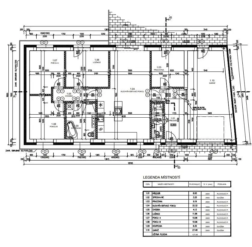 garáž s vraty na dálkové ovládání 27,48 m2 s umyvadlem/výlevkou a přípravou na pračku a sušičku, předsíň 8,93 m2, 1. koupelna s WC, umyvadlem a sprchovým koutem 3,20 m2, pracovna/šatna 9,19 m2, obývací pokoj s kuchyňským koutem 32,32 m2, chodba 4,13 m2, ložnice 11,96 m2, pokoj 10,96 m2, pokoj 10,96 m2, 2. koupelna s WC, vanou, sprchovým koutem a dvojumyvadlem 8,35 m2.