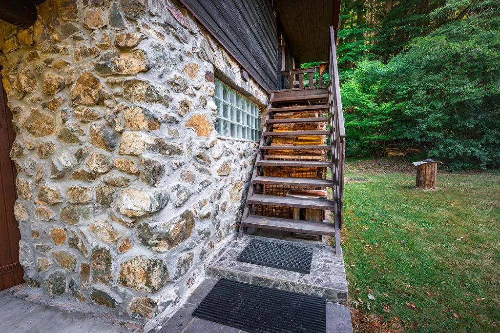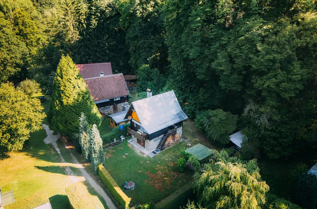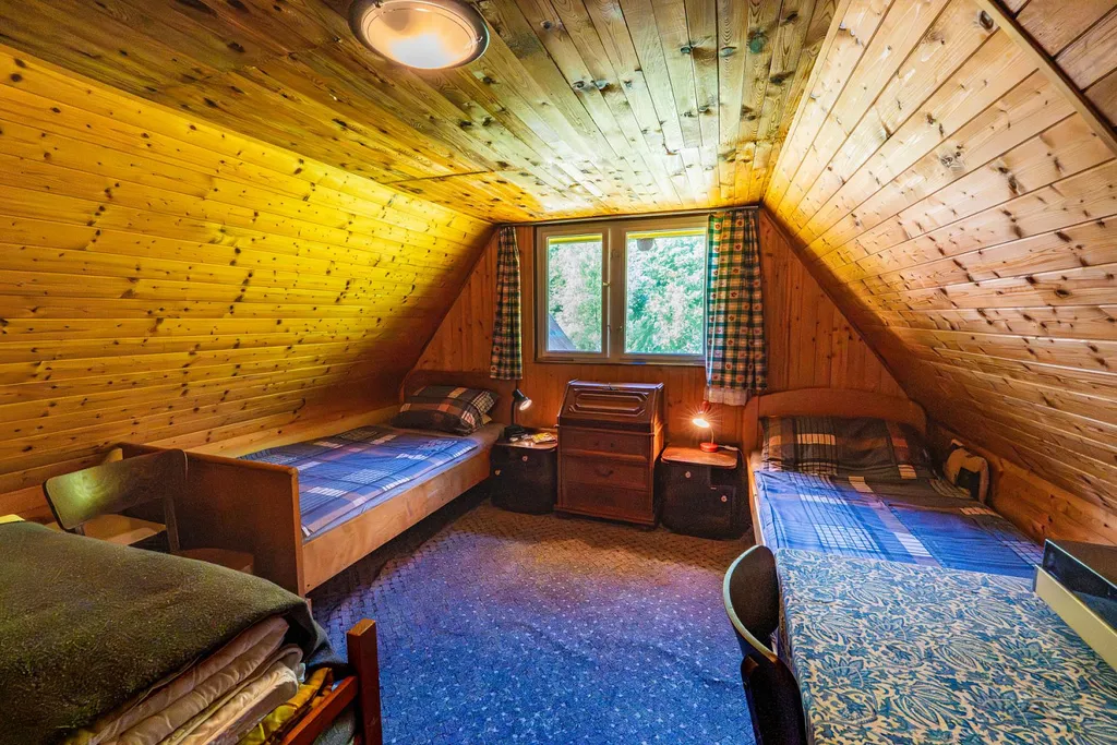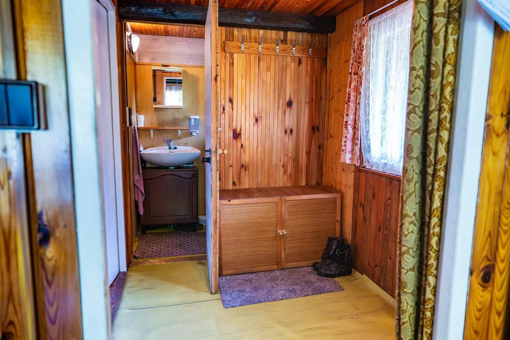Venkovní dřevěné schodiště nás zavede do obytné části chaty, kdy se ze vstupní předsíně dostaneme do jedné ze tří ložnic, na samostatného WC s umyvadlem a rovněž do obytné místnosti s kuchyňským koutem odkud je přímý vstup na menší verandu se stínící markýzou a výhledem na louku, k řece, nebo taky k zelené vstupní bráně na příchozí návštěvníky. Schodištěm z předsíně vystoupáme do obytného podkroví, kde se nachází další dvě samostatné ložnice.