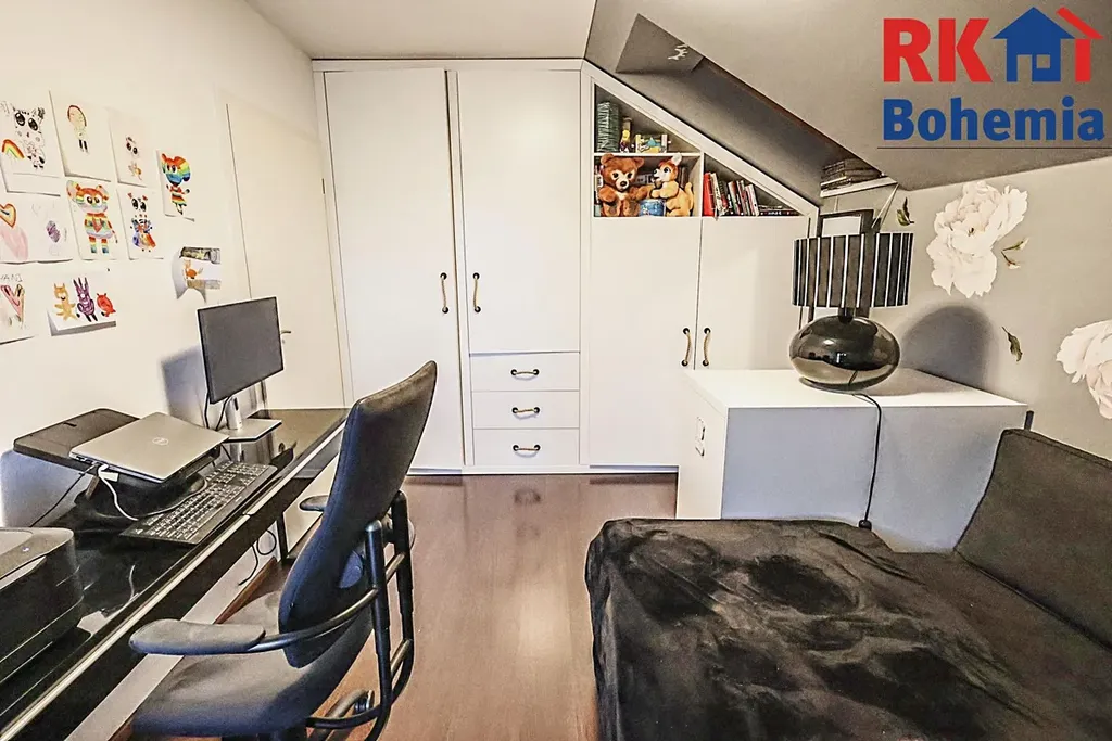 V prvním patře se nachází čtyři pokoje, které jsou nyní využívány jako ložnice, pracovna, dětský pokoj se šatnou a čtvrtý pokoj přestavěný na prostornou šatnu. Okna jsou vybavena venkovními elektrickými žaluziemi, včetně střešních, což zajišťuje soukromí, tepelnou pohodu a bezpečnost.