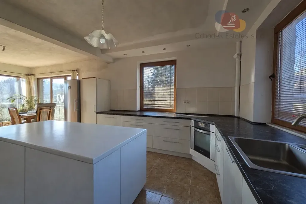Tento dvoupodlažní rodinný dům o podlahové ploše cca 162 m2 nabízí vše, co pro život na vesnici potřebujete. V prvním podlaží najdeme velkorysou obývací místnost propojenou s prostornou a světlou kuchyní. Dominantou je zde krb s horkovzdušným rozvodem do druhého podlaží, kam nás zavede dřevěné schodiště.