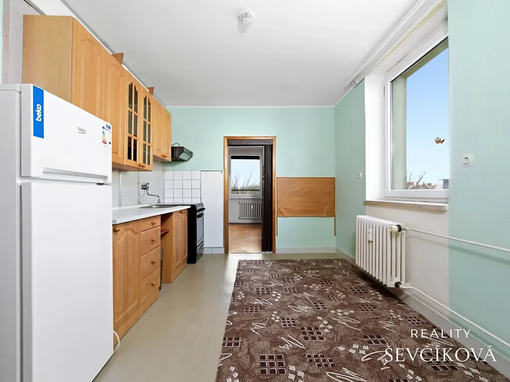 Dispozice bytu: předsíň, komora, chodba, koupelna s vanou, samostatné WC, dvě neprůchozí ložnice, velmi prostorný obývací pokoj se vstupem na lodžii a kuchyně s prostorem pro jídelní stůl.