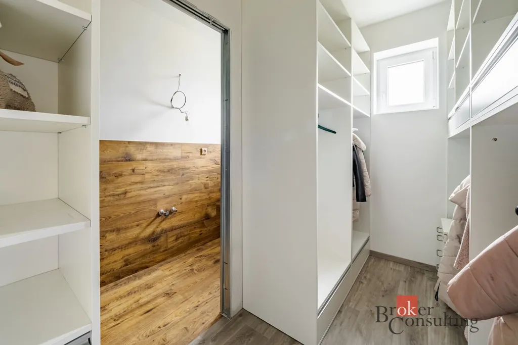 Součástí domu je prostorná garáž s parkováním pro dvě vozidla, která není průchozí přímo z domu. V garáži se zároveň nachází samostatné WC, což zvyšuje komfort využití prostoru například při práci na zahradě nebo v dílně.