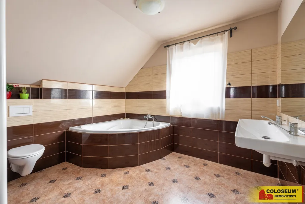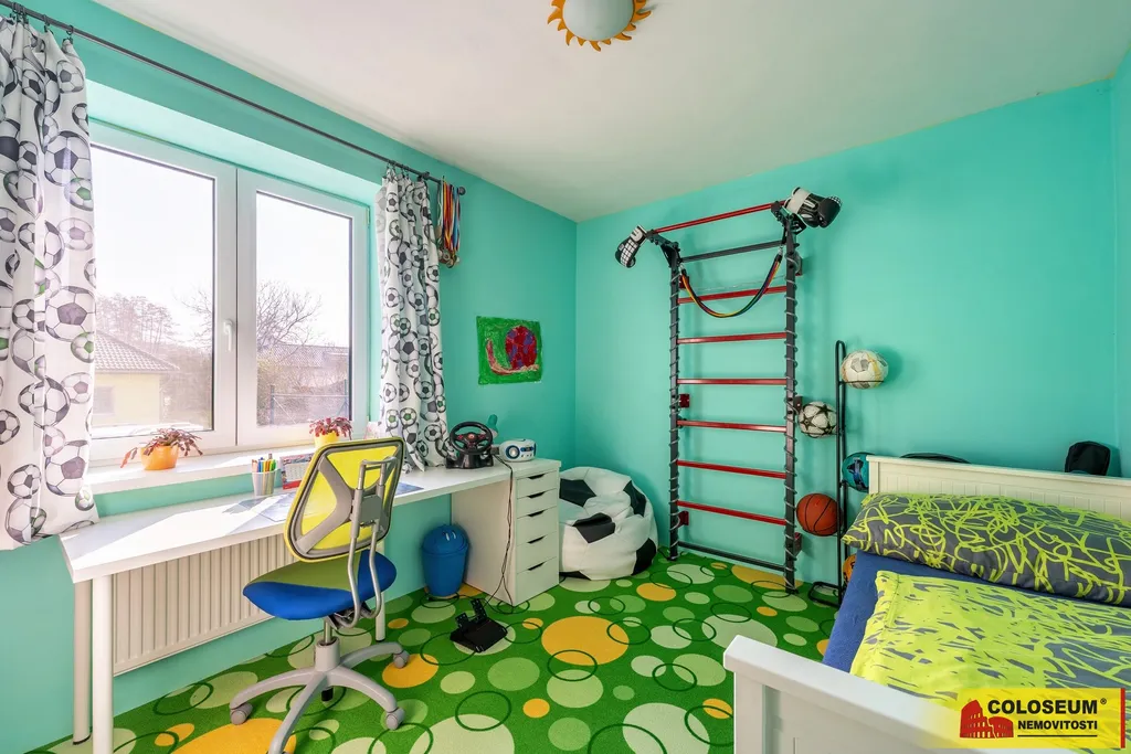 Dispozice nabízí pět samostatných pokojů, které lze využít například pro až tři děti nebo jako kombinaci ložnice a pracovny, a dvě koupelny s WC. V přízemí se nachází koupelna se sprchovým koutem, v patře je druhá koupelna s vanou.