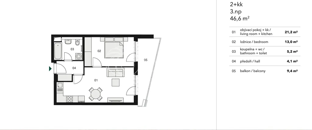 Jednotka je umístěna ve 3. podlaží čtyřpatrové budovy s výtahem a kamerovým systémem. Disponuje plochou 46,6 m2 a lodžií 9,4 m2.