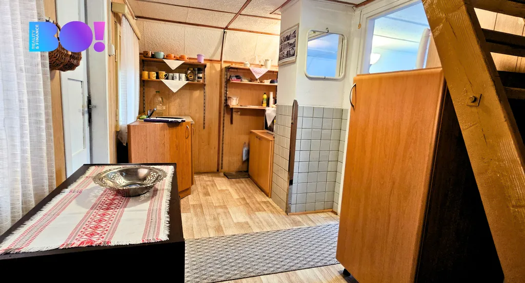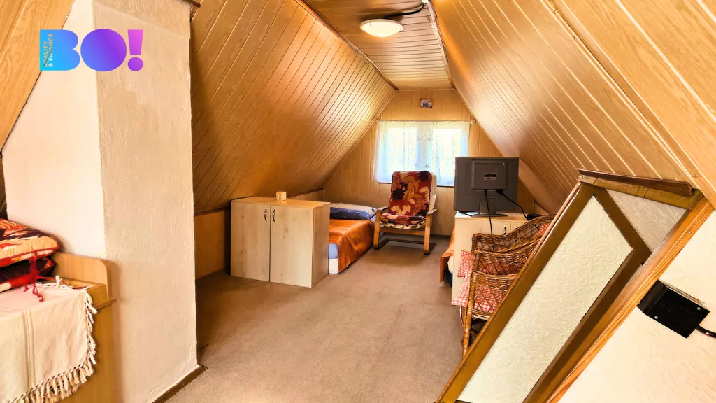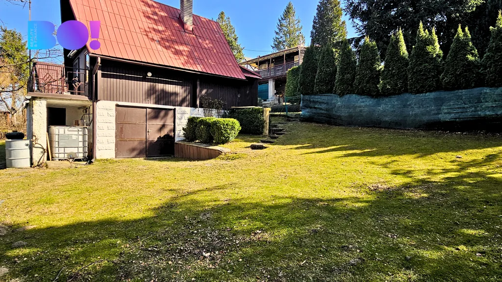 V přízemí je garáž v současnosti využívaná jako praktická letní kuchyň. Na zahradě je připravené posezení s ohništěm, ideální pro odpočinek a setkávání s rodinou či přáteli. Parkovat můžete buď před chatou na cestě, nebo branou vjet na pozemek přímo k chatě, což je velkou výhodou při větších nákupech nebo když si chcete vypulírovat auto.