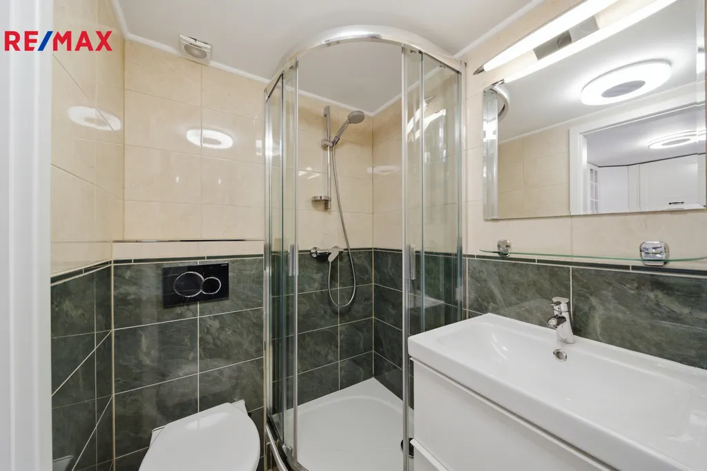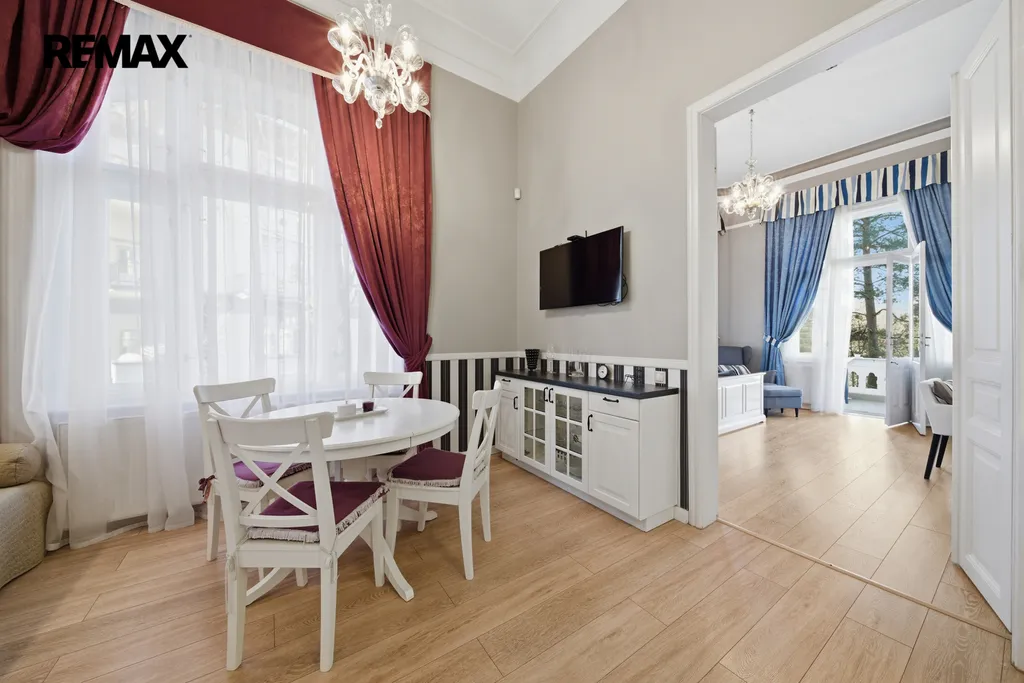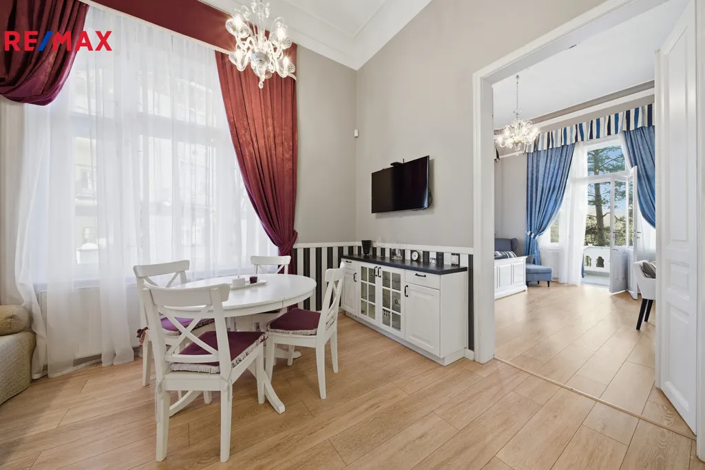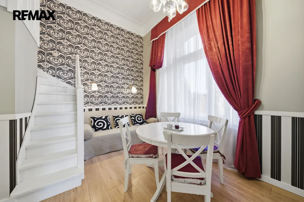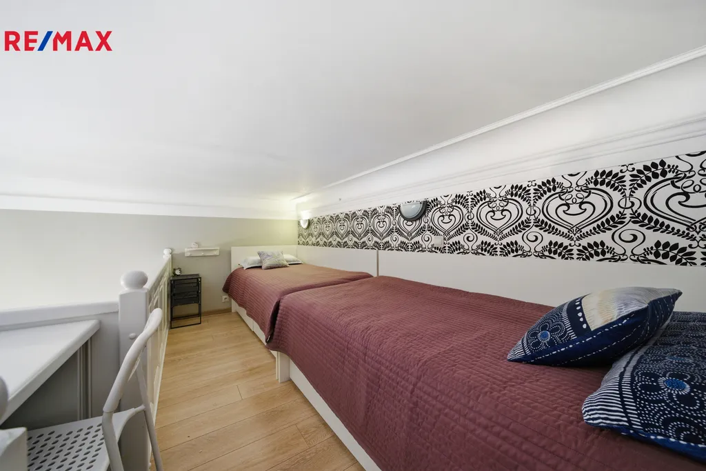 Dominantou bytu je vzdušný obytný prostor se spacím patrem, které zajišťuje pohodlí i soukromí. Kuchyňský kout je citlivě zakomponován do interiéru tak, aby působil čistě a nerušil celkový dojem. Koupelna je vybavena sprchovým koutem, WC a bidetem. Další samostatné WC přispívá k vyššímu komfortu domácnosti i návštěv. V bytě jsou kvalitní parkety a dlažba, repasovaná okna i dveře podtrhují charakter prostoru. Samozřejmostí je kompletní a stylové zařízení – stačí se jen nastěhovat. Příjemným bonusem je balkón s krásným výhledem, ideální pro ranní kávu či večerní relax.