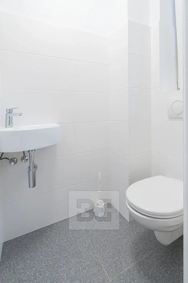Byt disponuje koupelnou se sprchovým koutem a toaletou, a navíc je zde další samostatná toaleta.