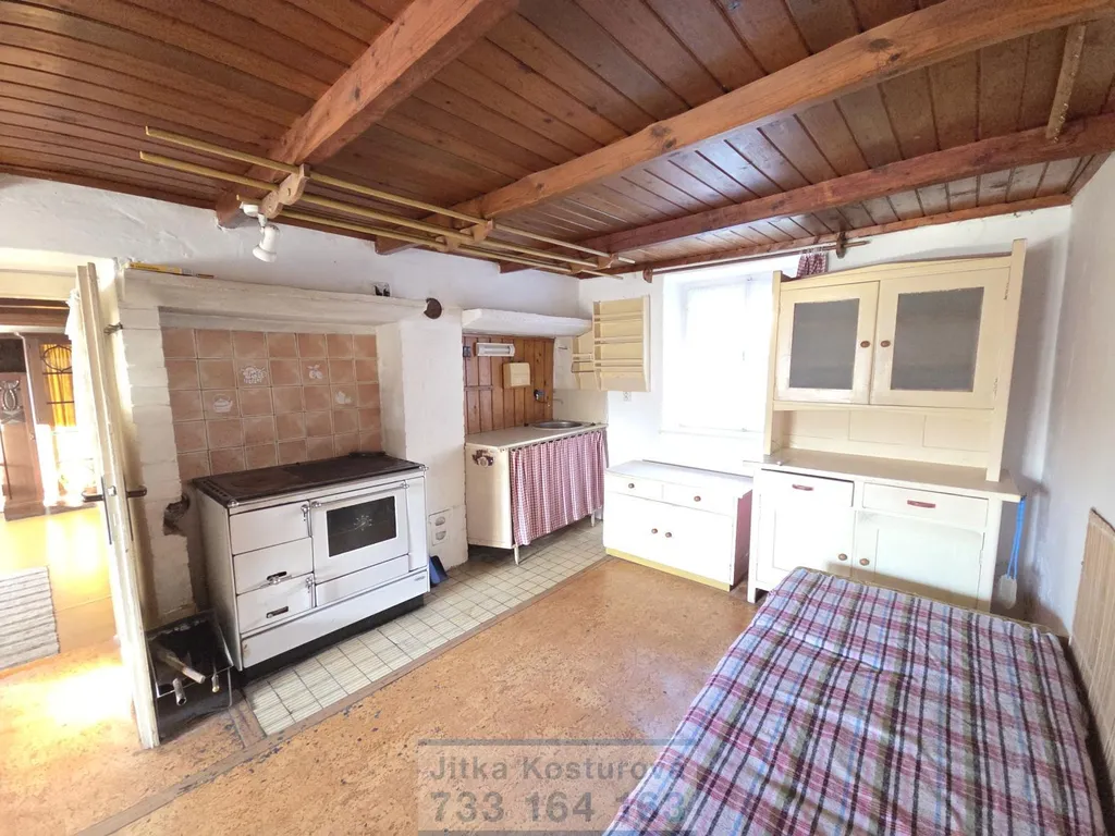 Dispozice domu je praktická a nabízí dostatek prostoru. V přízemí se nachází vstupní chodba, útulná kuchyně s kamny, která slouží k vytápění i vaření (součástí je také malý sklep), dále pokoj s přípojkou na krbová kamna, komora, koupelna a dílna. Po dřevěném schodišti se dostanete do horního mezaninu, kde se nachází půdní prostory a letní pokoj vhodný například pro hosty nebo odpočinek v letních měsících.