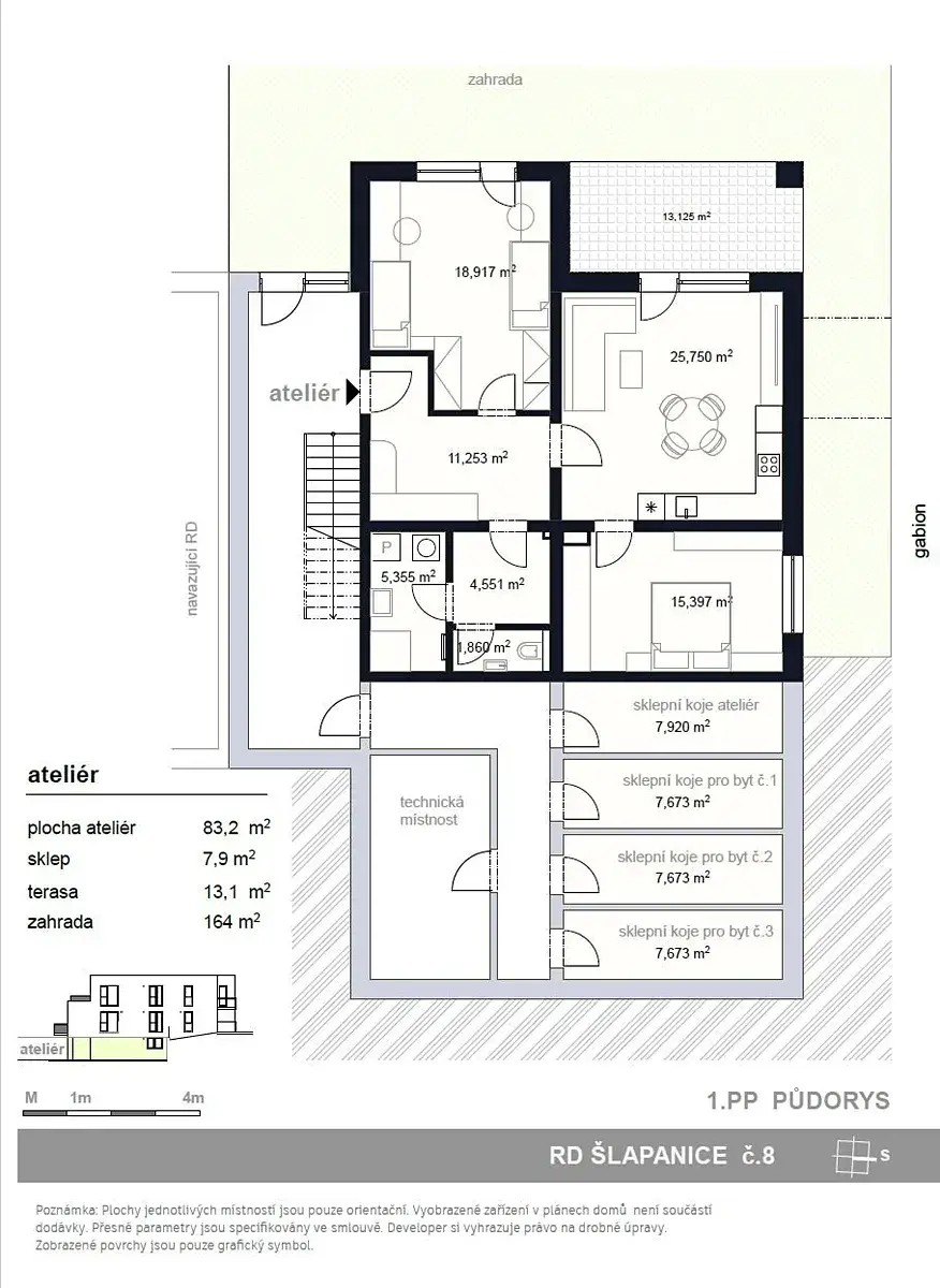 V tomto projektu nabízíme k prodeji ateliér 3+KK s terasou 13,12m2, zahradou 164m2, sklepem 7,9m2 a 1 parkovacím stáním vše je součástí kupní ceny.