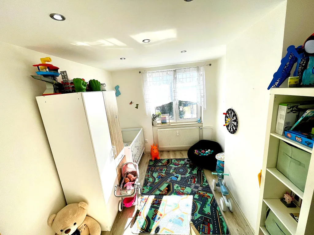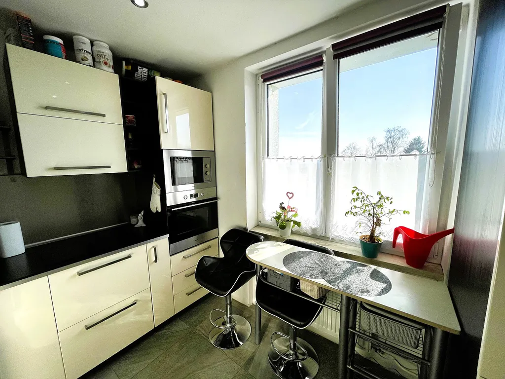 Byt se nachází ve třetím nadzemním podlaží a skládá se z kuchyně, obývacího pokoje, ložnice, dětského pokoje, koupelny s vanou, samostatného WC, technické místnosti (pračka,…). Podlahová plocha bytu činí 58 m². K bytu náleží sklepní kóje.