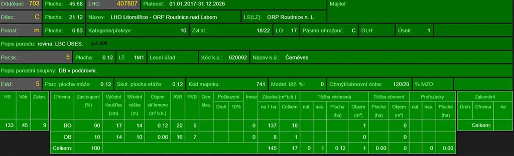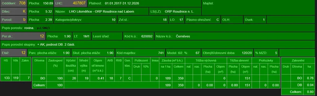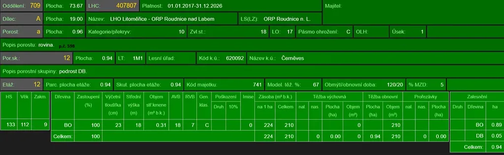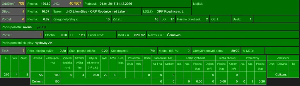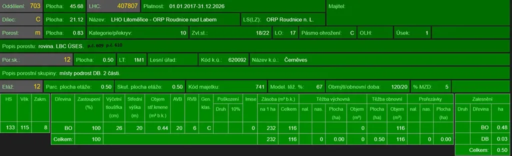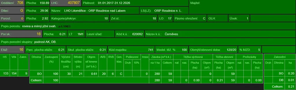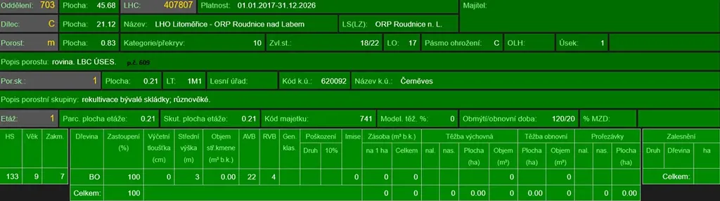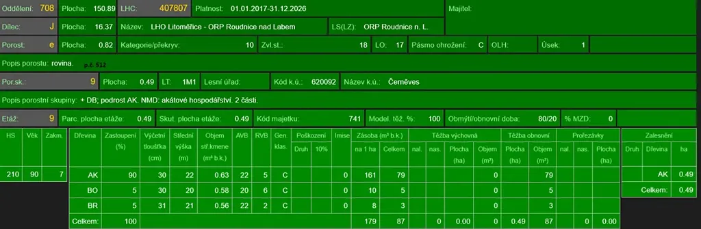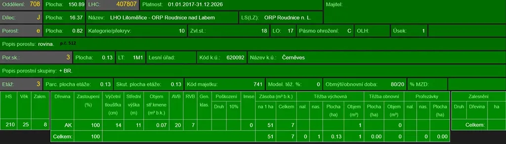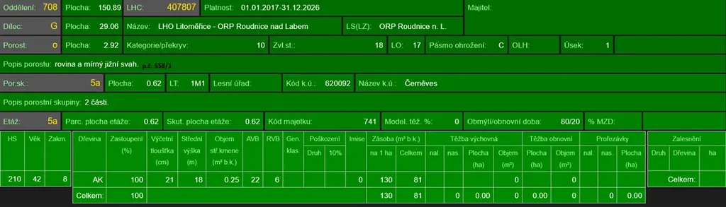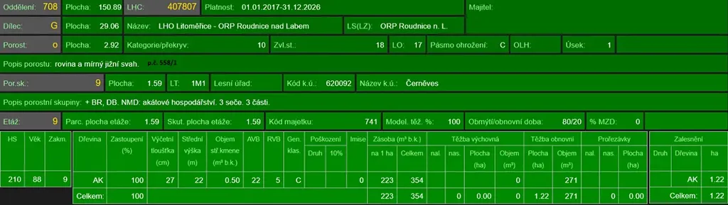 - p.č. 558/1 vedená jako lesní pozemek o celkové výměře 29 368 m2, z toho vlastníme podíl 1/9 tedy 3 263 m2 (stáří lesa 163 let - zastoupení dřevin borovice, stáří lesa 97 a 51 let - zastoupení dřevin akát),
