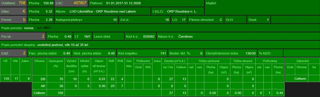 - p.č. 609 vedená jako lesní pozemek o celkové výměře 6 456 m2, z toho vlastníme podíl 1/9 tedy 717 m2 (stáří lesa 142 a 124 let - zastoupení dřevin borovice, stáří lesa 54 let - zastoupení dřevin borovice, dub),