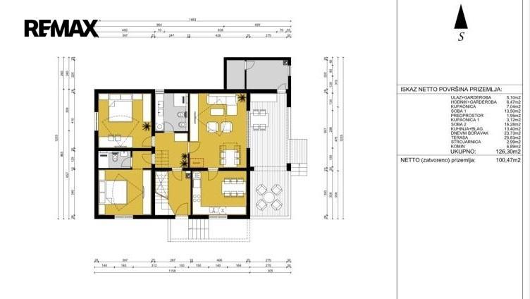 Zařízený samostatně stojící dům s velkou zahradou a bazénem, o rozloze 245 m2 a skládá se z přízemí a horního patra.