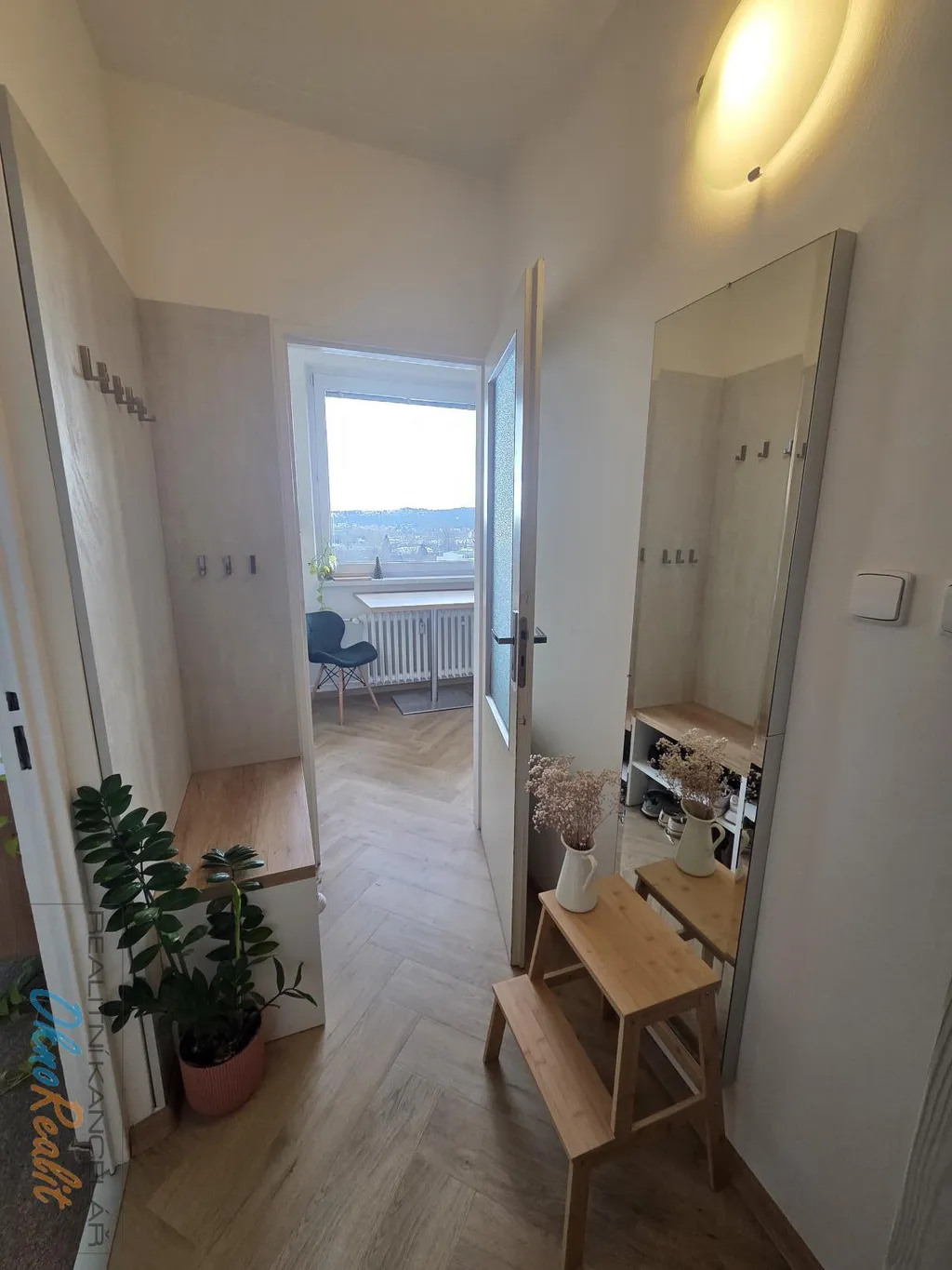 Lze využívat lodžii na mezipatře. K bytu náleží sklep v 1.NP. Plastová okna mají žaluzie.