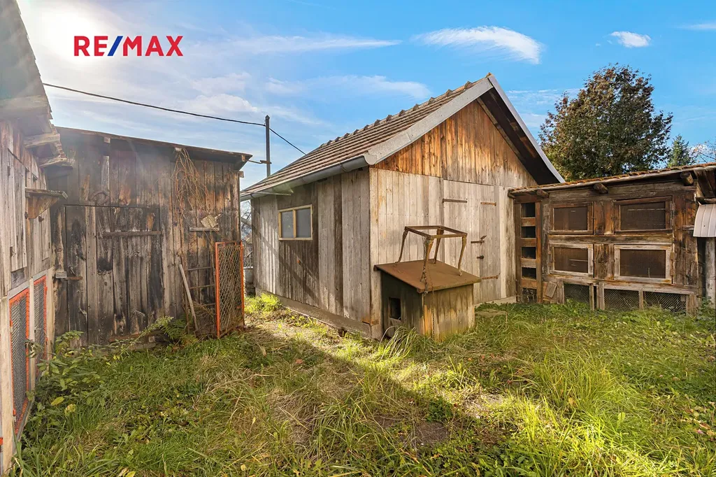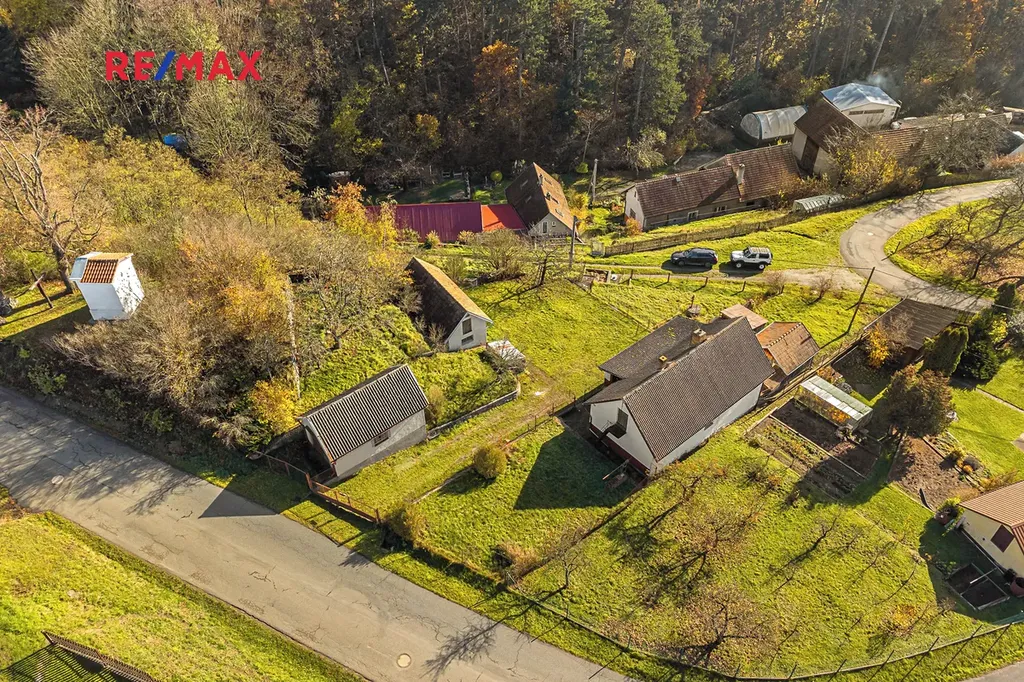 Nemovitost stojí na prostorném, jižně orientovaném pozemku o celkové výměře 1 455 m² a kromě samotné chalupy k ní náleží také soubor vedlejších staveb – zděné i dřevěné kůlny a zděné garáže, které poskytují dostatek prostoru pro dílnu, skladování i parkování.