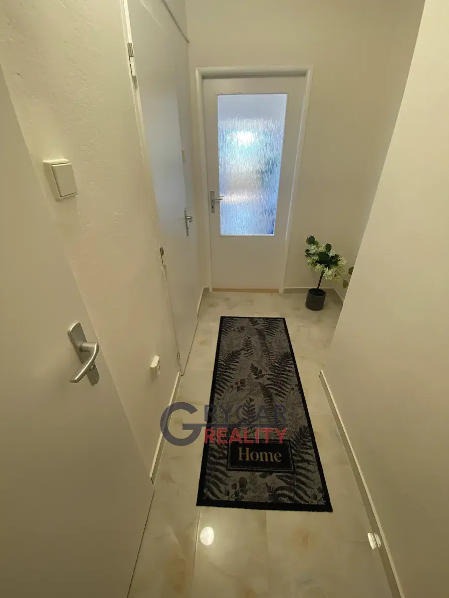 Dispozice bytu: vstupní chodba (3,66 m2), vlevo samost. WC (1,10 m2), vedle koupelna (2,04 m2) se sprchovým koutem, umyvadlem, skříňkou a přípravou pro pračku.