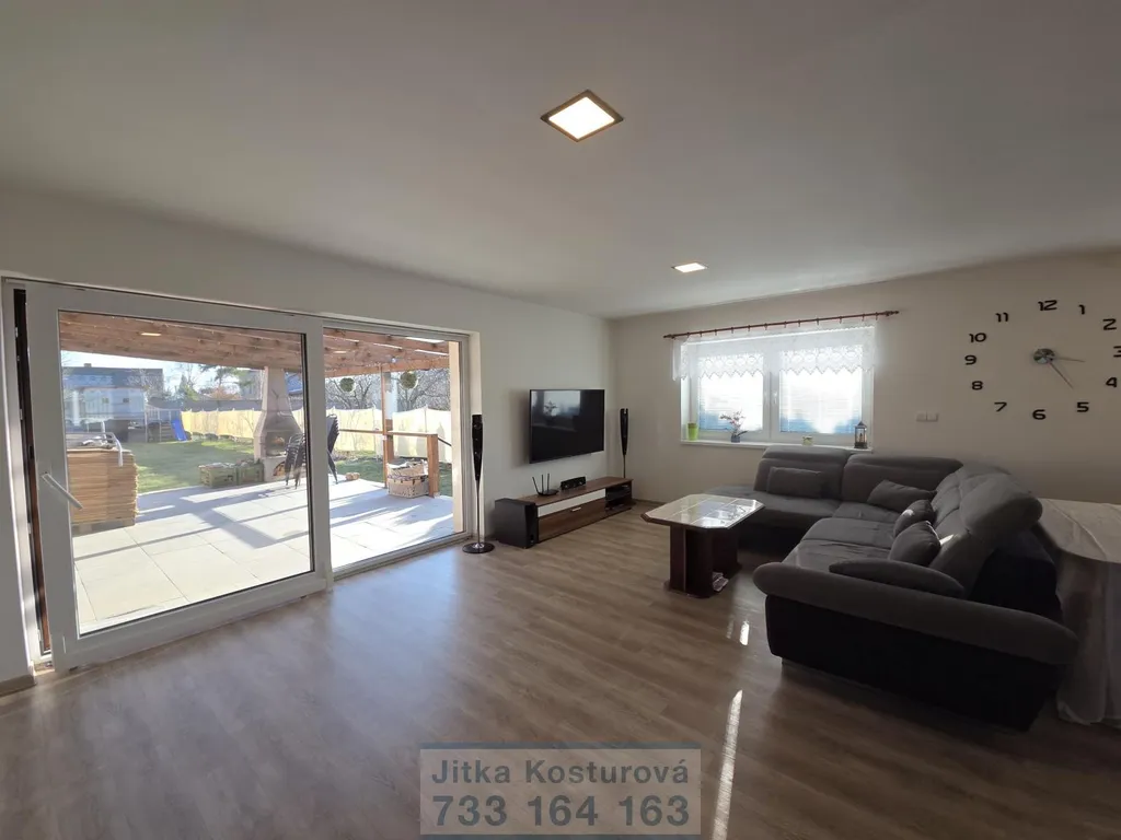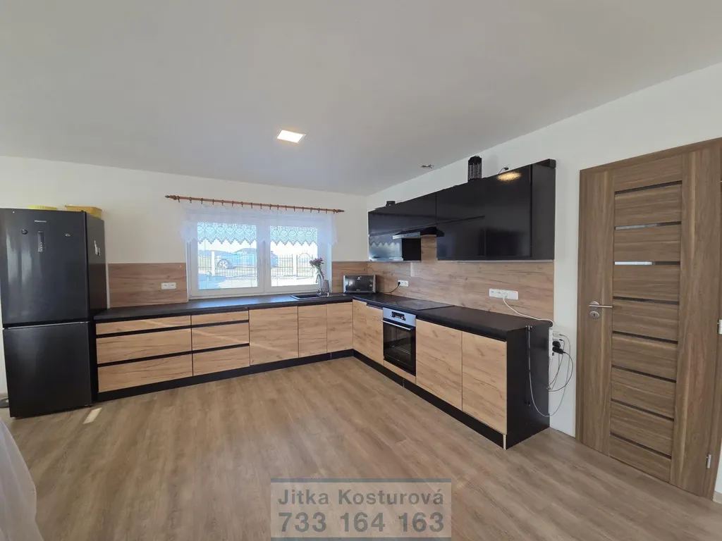 Dominantou domu je prostorný obývací pokoj s kuchyňským koutem, odkud je přímý vstup velkými prosklenými dveřmi na terasu a zahradu. Kuchyňská linka je vybavena indukční varnou deskou, elektrickou troubou, digestoří a myčkou. Praktickým doplňkem je komora na potraviny.